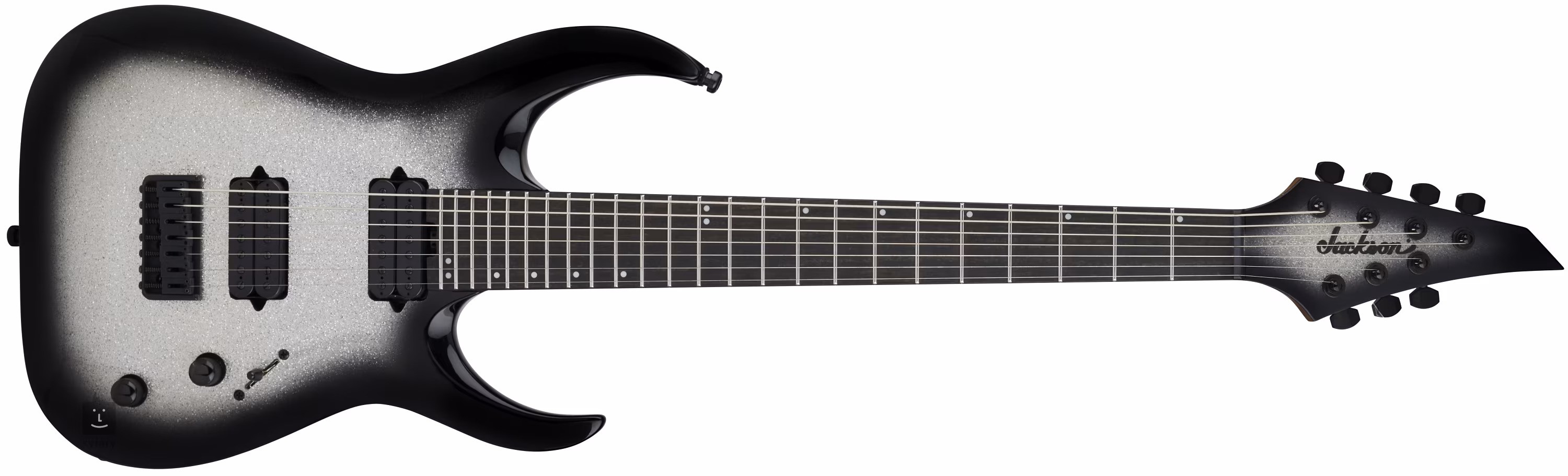 Der Pappelkorpus des siebensaitigen Signature Pro Misha Mansoor Juggernaut HT7 EB SSP Modells ist mit einem glänzenden Finish in Silverburst Sparkle versehen. Der Hals aus karamellisiertem Ahorn mit Graphitstreben ist mit einem Ebenholzgriffbrett verschraubt, das mit vierundzwanzig Jumbo-Edelstahlbünden ausgestattet ist. Ein eindeutiges Plus für schnelle Spieler ist der flache Griffbrettradius (20 Zoll) und die abgerundeten Griffbrettkanten. Die Orientierung auf dem Griffbrett wird auch in der Dämmerung durch versetzte Positionspunkte und seitliche Leuchtmarkierungen erleichtert.