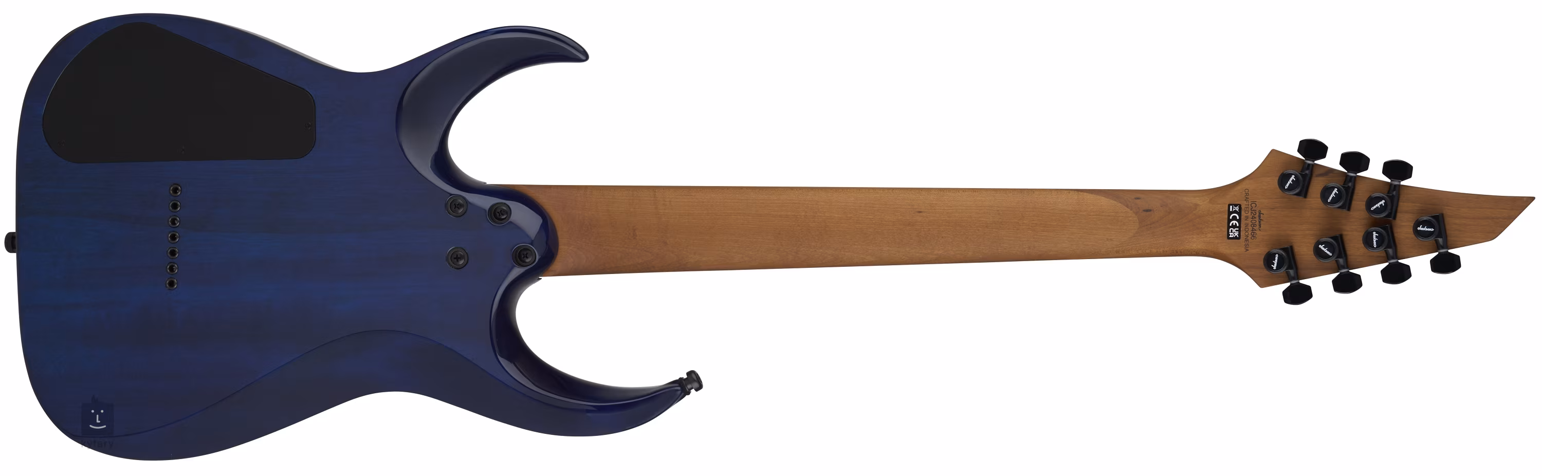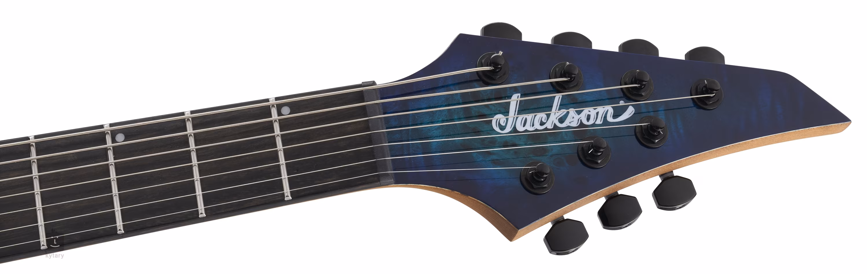 Für Stimmstabilität und gute Intonation sorgen die Saitenbefestigung in den arretierbaren Druckgussantrieben der Firma und der durchgehende Jackson HT7-Saitenhalter.