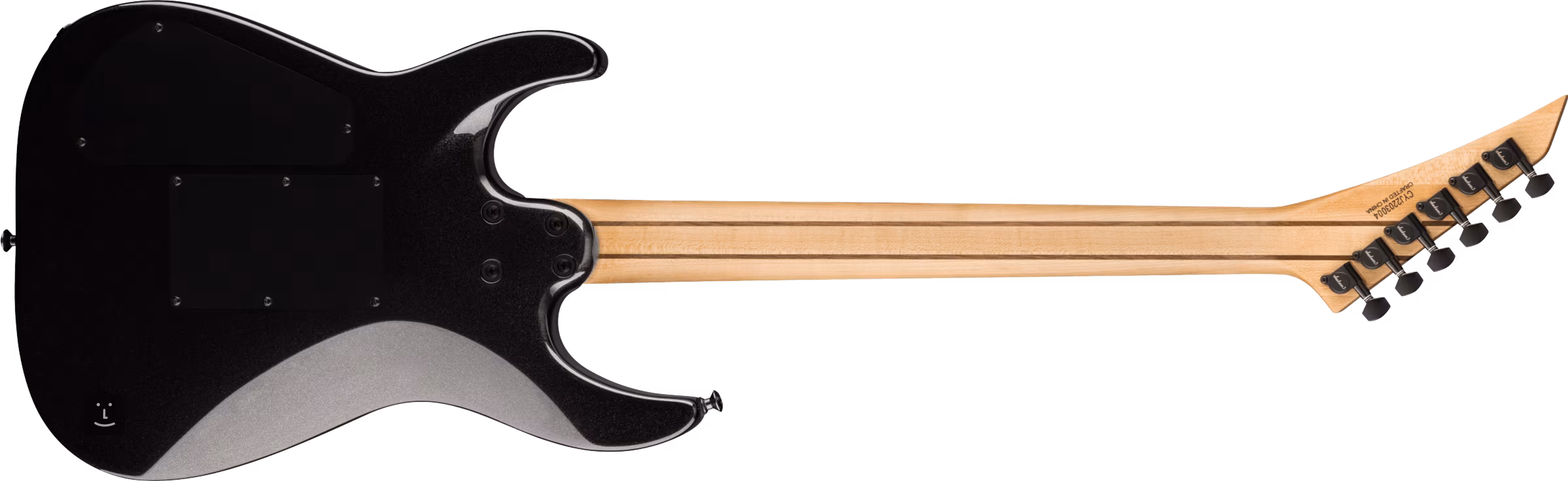 Der gewölbte Korpus der Pro Plus Series DKA Metallic Black E-Gitarre ist aus Okoumé gefertigt. Ein Ebenholz-Griffbrett mit vierundzwanzig Jumbo-Bünden aus rostfreiem Stahl ist auf einen verschraubten, fünfteiligen Hals aus Ahorn und Walnuss geklebt, der mit Graphitstreben verstärkt ist. Der kombinierte Radius des Griffbretts ermöglicht sowohl komfortables Riffing am Nullbund als auch bequemes, ultraschnelles Shredden an den höheren Bünden. Die Orientierung auf der Griffbrettoberfläche wird durch versetzte Positionsmarker aus Perlmuttimitat und seitlich angebrachte Leuchtpunkte erleichtert, die auch in den dunkelsten Bereichen der Bühne perfekte Sichtbarkeit garantieren.