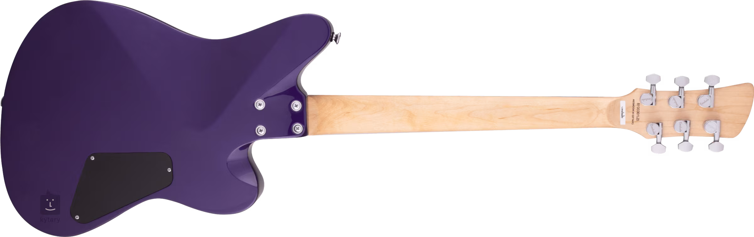 Die Saiten sind in der firmeneigenen Verriegelungsmechanik und dem einstellbaren Jackson TOM-Style Saitenhalter und den Saitenreitern verankert. Das originelle Design des Instruments wird durch die Farbgebung in Purple Metallic und die verchromte Hardware unterstrichen.