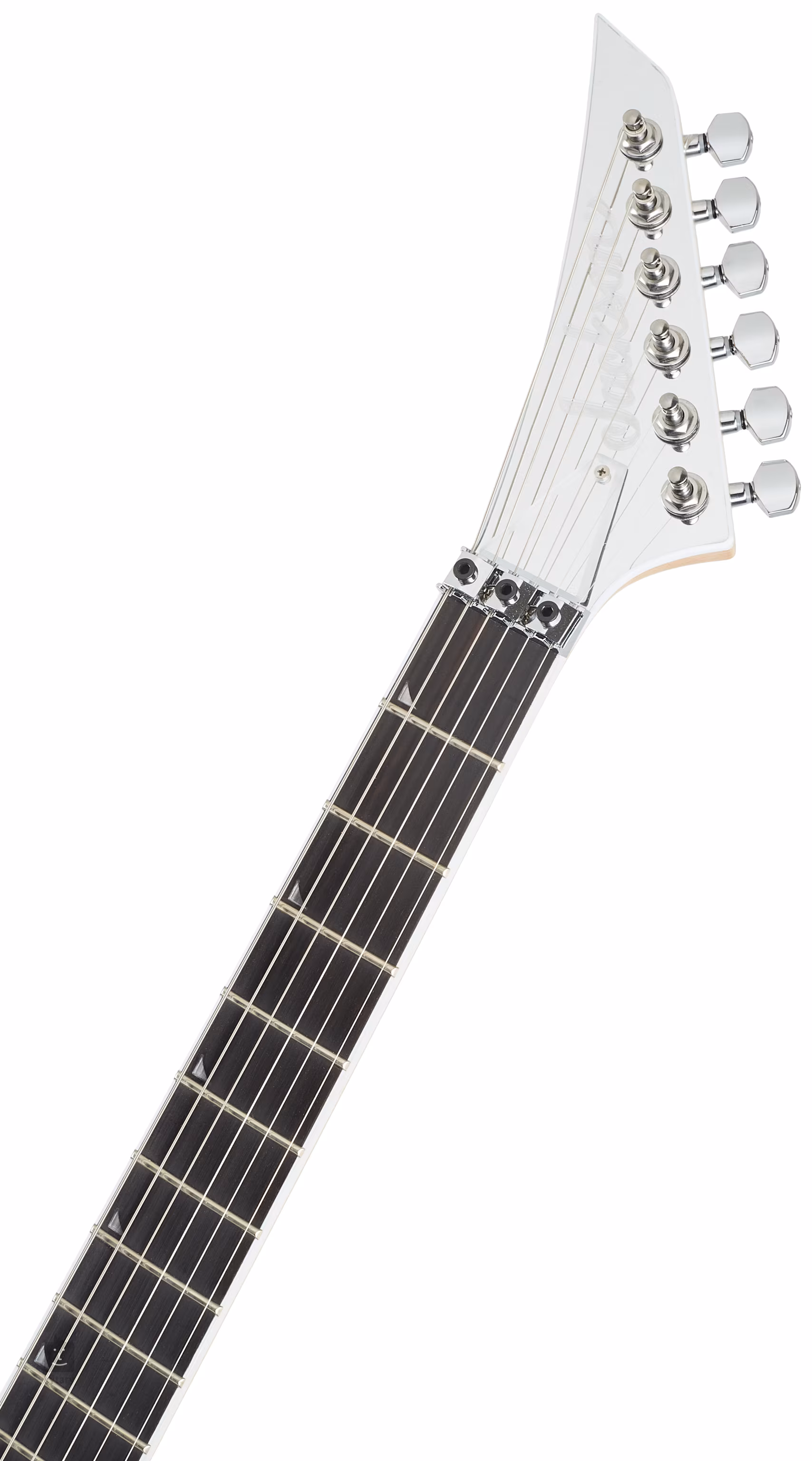 Die Konstruktion dieser Gitarre besteht aus einem Limonen-Korpusflügel, einer spektakulären Spiegeldecke und einem durchgefrästen Ahornhals, der mit Graphitbeleistung verstärkt ist. Diese Konstruktion wirkt sich positiv auf das Sustain des Instruments aus. Das Ebenholz-Griffbrett ist mit vierundzwanzig Jumbo-Bünden ausgestattet. Der Radius flacht zum Korpus hin ab - das ermöglicht sowohl komfortables Riffspiel am Nullbund als auch bequemes, ultraschnelles Shredden in höheren Lagen. Die Piranha Tooth-Positionsmarker erleichtern die Navigation auf dem Griffbrett.