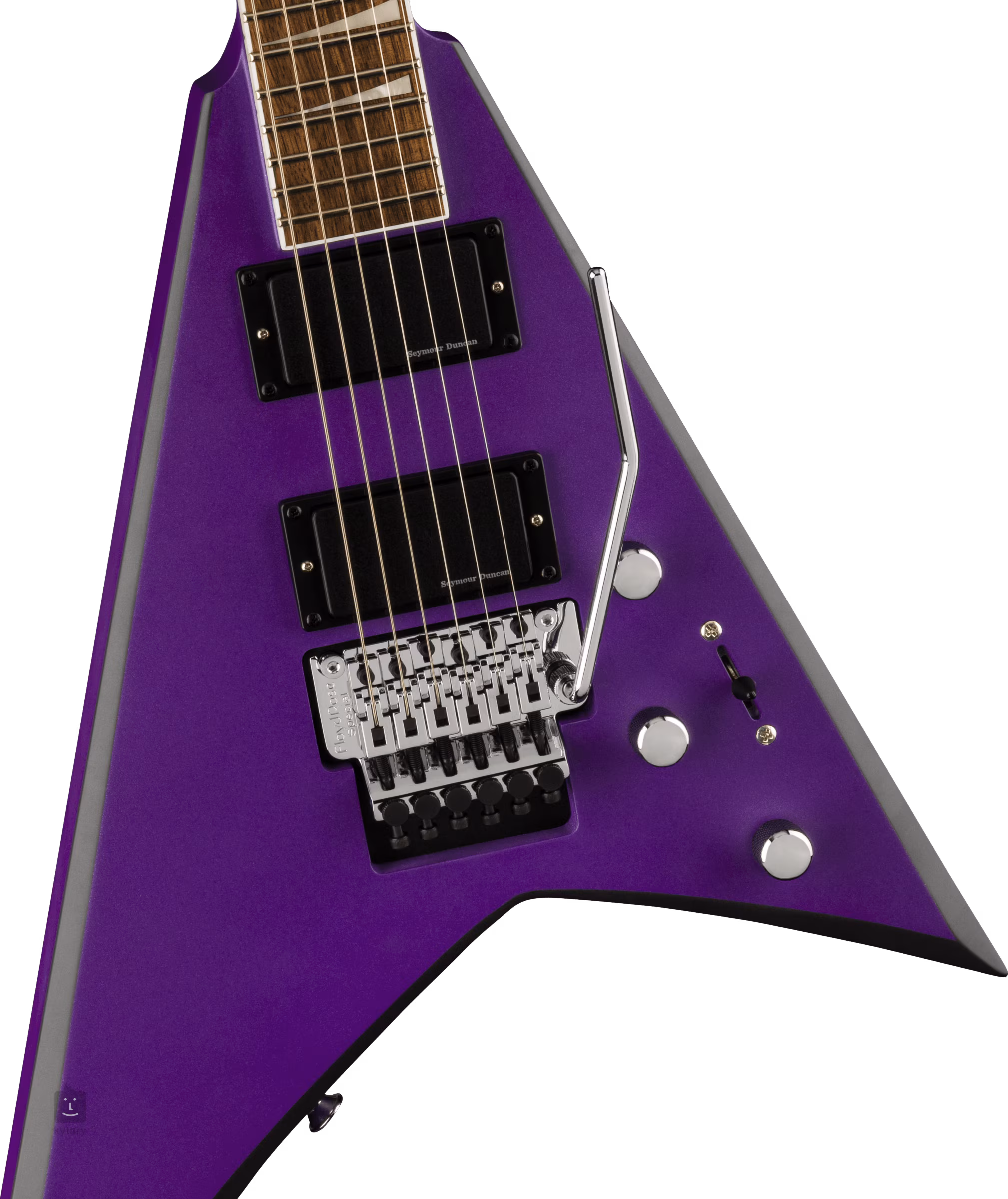 Die Konstruktion der X Series Rhoads RRX24 Purple Metallic with Black Bevels besteht aus einem Pappelkorpus und einem durchgehenden Hals aus einem Stück Ahorn mit Graphitbeleistung. Diese Konstruktion wirkt sich positiv auf das Sustain des Instruments aus. Das Feigengriffbrett ist mit vierundzwanzig Jumbo-Bünden ausgestattet. Sein Radius flacht zum Korpus hin ab - das ermöglicht sowohl komfortables Riffspiel am Nullbund als auch bequemes ultraschnelles Shredden in höheren Lagen. Positionsmarkierungen aus sharkfin-Pearl-Imitat erleichtern die Orientierung auf dem Griffbrett.