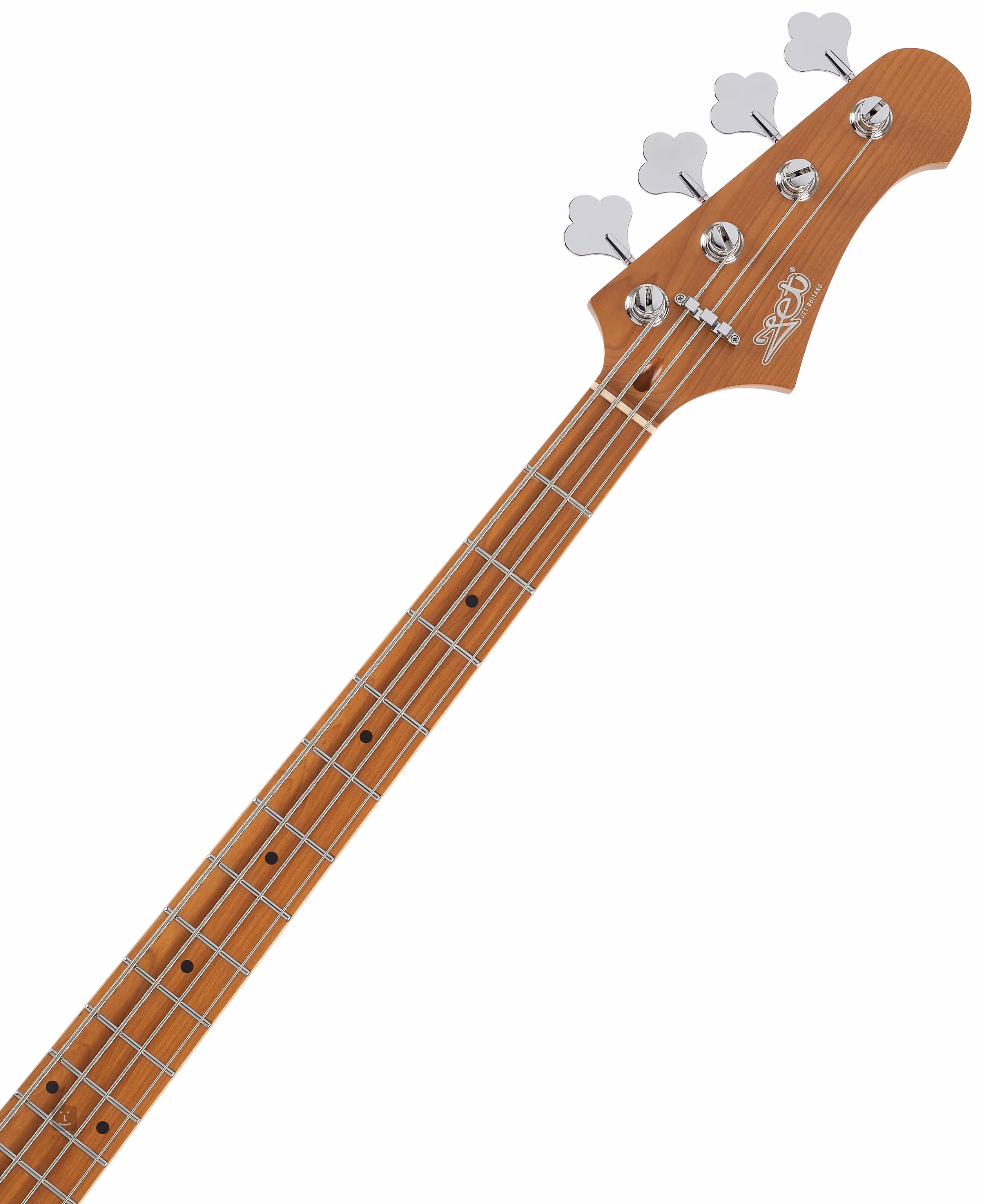 Der Bass ist mit zwei JB-Tonabnehmern ausgestattet. Mit den Lautstärkereglern der Tonabnehmer und dem Tone-Diaphragma-Potentiometer kann man den Klangcharakter einstellen. Die Saiten sind in verchromten Mechaniken im Vintage-Stil und einem Vier-Sattel-Saitenhalter gelagert. Das stilvolle Finish wird durch das Schlagbrett aus Schildpatt-Imitat und das Firmenlogo auf der Kopfplatte noch unterstrichen.