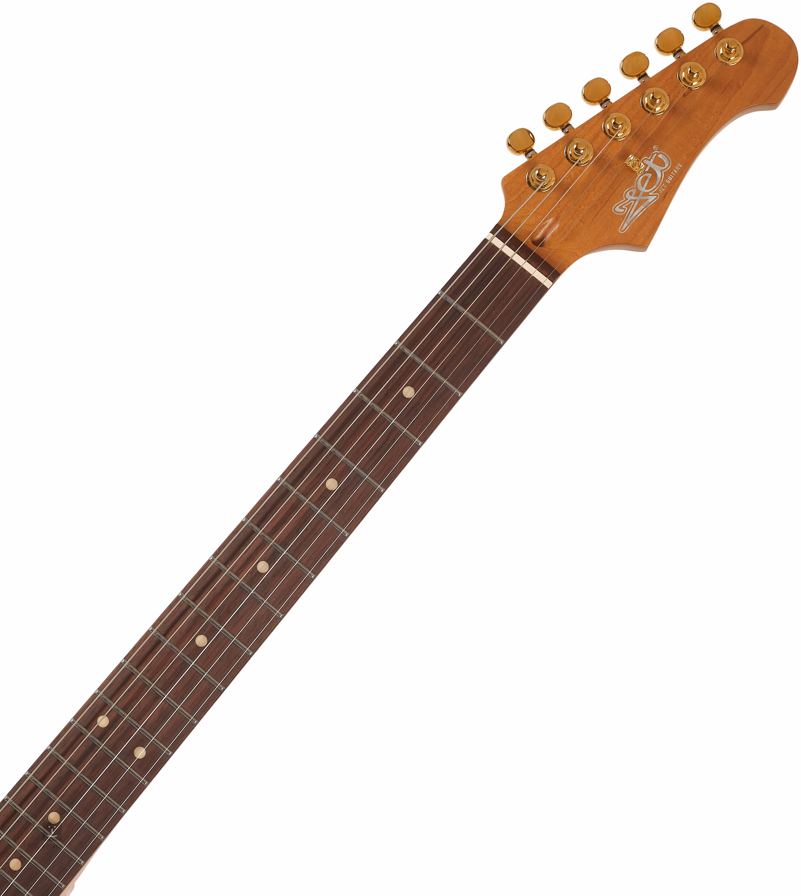 Der Korpus der JS-380 RD G E-Gitarre ist aus geröstetem Pappelholz gefertigt. Ein Palisandergriffbrett mit zweiundzwanzig Bünden ist auf einen verschraubten Hals aus kanadischem Ahorn geleimt. Der Hals wurde vor der Montage wärmebehandelt, was das Holz stabiler macht und ihm das Aussehen/Aura eines jahrelang gespielten Halses/Griffbretts verleiht.