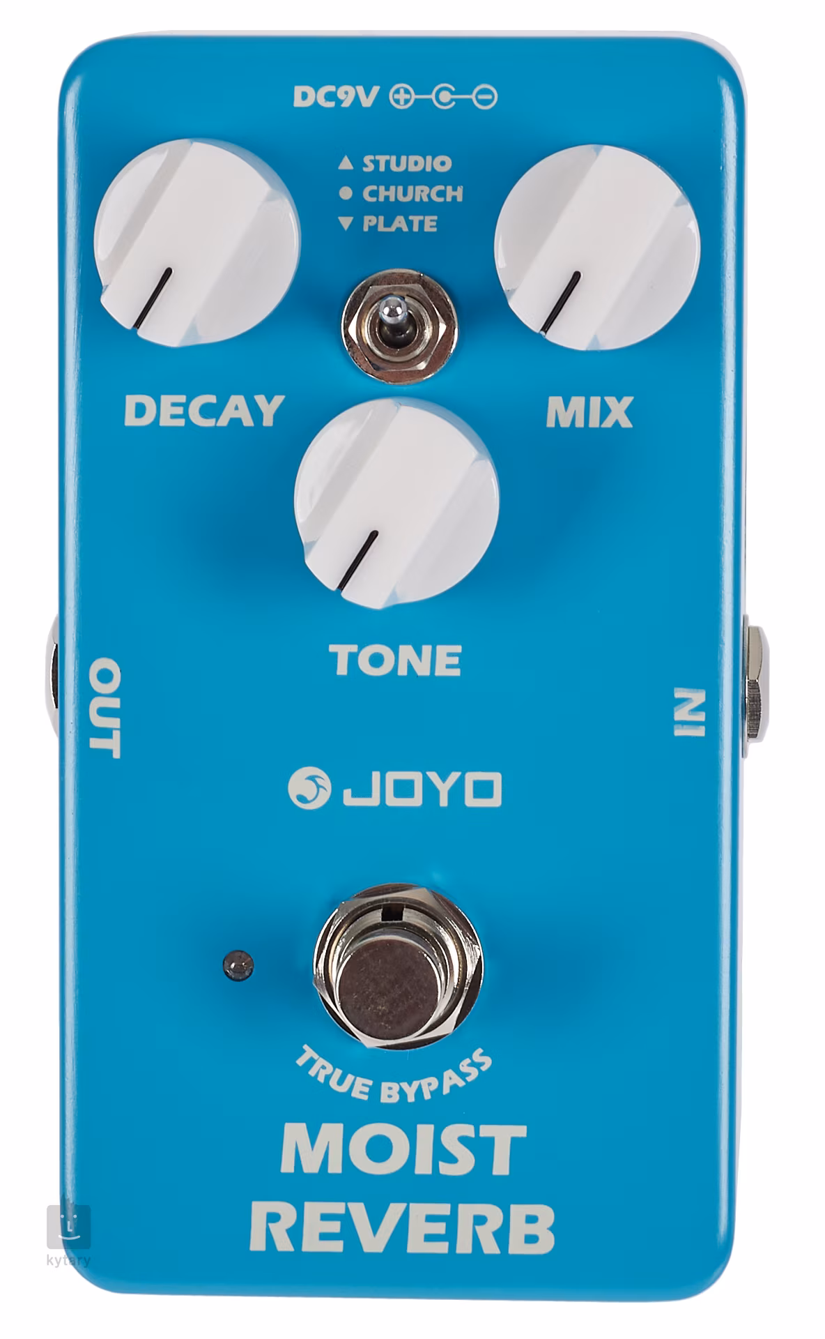 Das JF-20 Moist Reverb ist ein digitaler Hall mit einem 32-Bit-DSP-Chip und drei Halltypen - Studio, Church und Plate - sowie drei Reglern zur Einstellung von Länge, Intensität und EQ des Effekts. Nichts Kompliziertes oder Revolutionäres, aber man bekommt genau das, was die Verpackung verspricht. Die gesamte Elektronik des Effekts ist in einem robusten Metallgehäuse untergebracht. Die Box arbeitet im True-Bypass-Modus, für die Stromversorgung ist ein 9V-Adapter erforderlich.