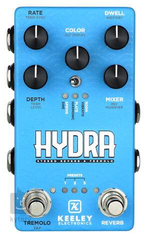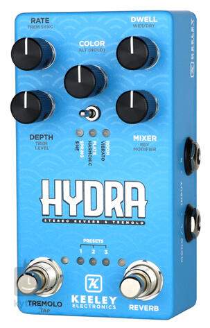 Der Hydra Pedal-Effekt von Keeley ist ein Stereo-Tremolo und Reverb, das auf dem Design des modernen Keeley Eccos-Effekts basiert. Er bietet drei Arten von Reverb-Effekten (Spring, Plate, Room) und drei Tremolo-Effekte im Vintage-Stil (Harmonic, Vibrato, Sine), deren Sounds Sie nach Belieben kombinieren können, um schöne, verträumte Ambient-Flächen zu schaffen - ob mit E-Gitarre, Bass oder Keyboard/Synth.