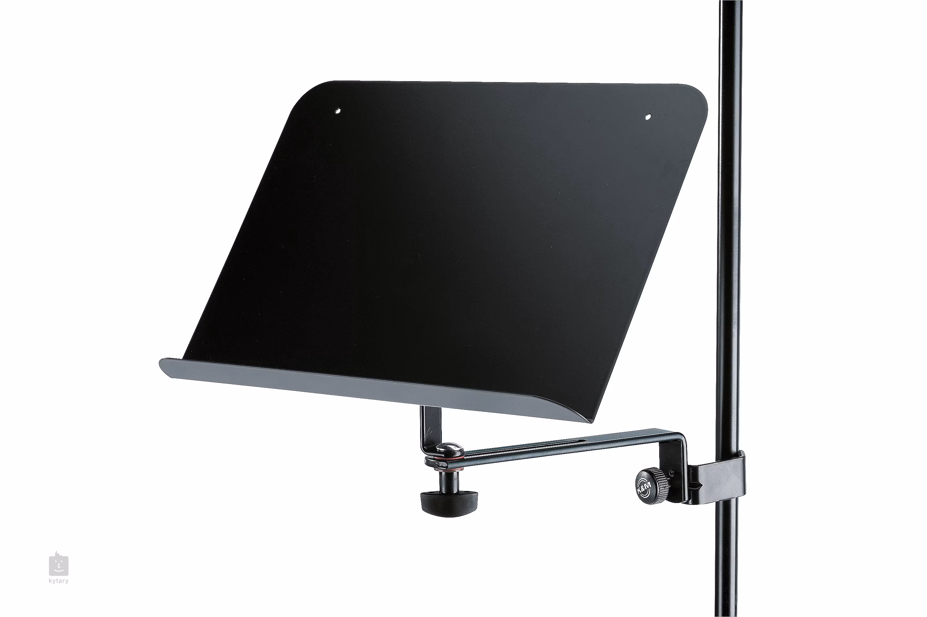 Neigungs- und tiefenverstellbares Stahl-Notenpult, das mittels eines Stahl-Klemmmechanismus fest an Ständern mit einem Stangendurchmesser von bis zu 30 mm angebracht werden kann.