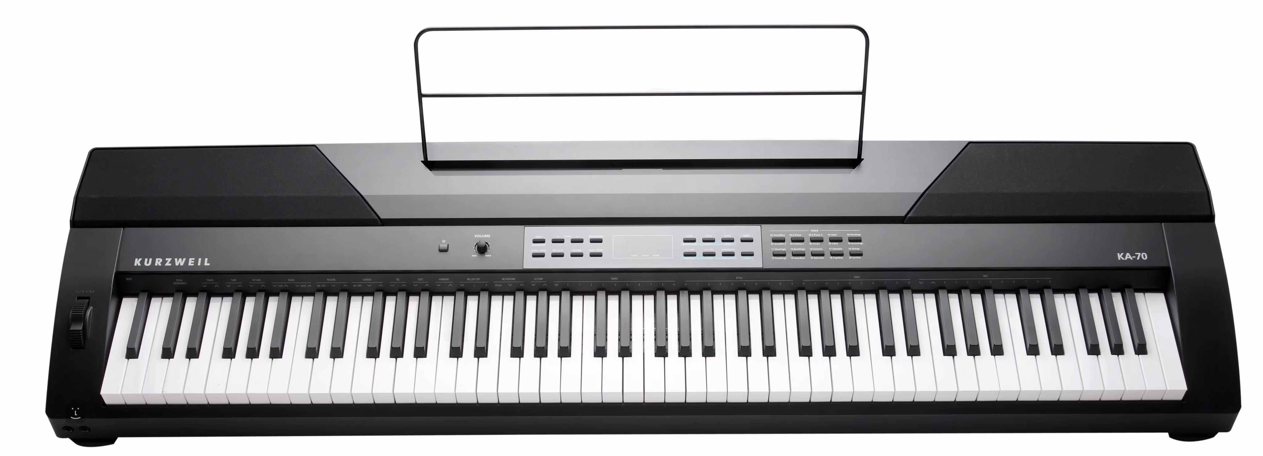 Das KA70 von Kurzweil ist ein tragbares Digitalpiano mit dynamischer Tastatur. Es hat achtundachtzig Tasten, also den Standard-Klavierbereich. Es bietet zwanzig hochwertige Corporate Presets mit Klängen von Klavier, Orgel, Streichinstrumenten (Gitarre, Bass, Streicher) und perkussiven chromatischen Instrumenten.