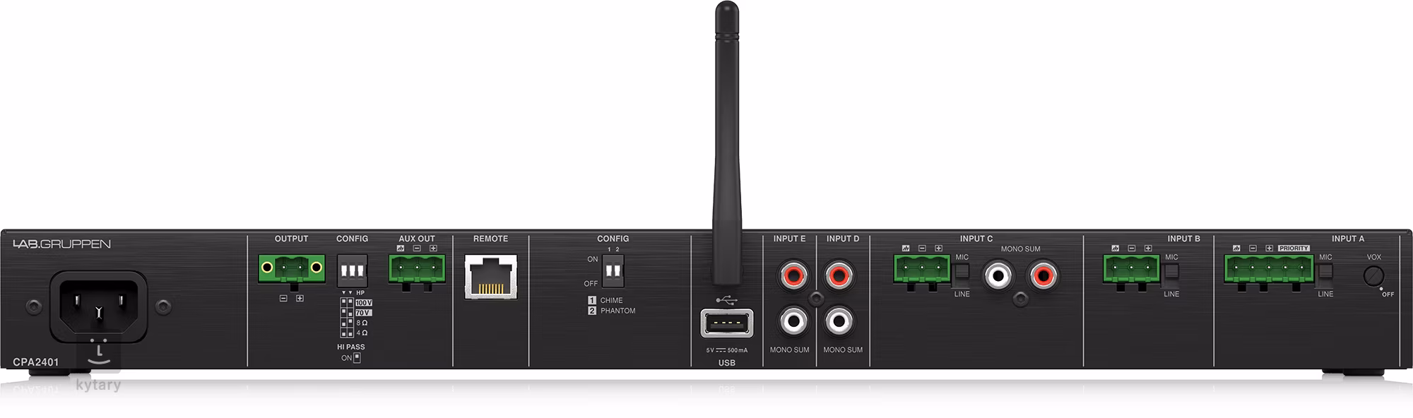 Der CPA2401 verfügt über eine Leistung von 1 x 240 W und bietet großartigen Sound für Lautsprecher in einem großen Restaurant, einem Einkaufszentrum, einem Hotel oder für Unternehmen und öffentliche Räume, in denen Hintergrundmusik oder Informationsdurchsagen laufen müssen. Sound von bis zu 4 verschiedenen Quellkanälen (Stereo/Line oder Mikrofon), einschließlich Streaming von Bluetooth-Geräten (Mobiltelefone, Tablets) oder über USB-Wiedergabe mit dedizierten Transportfunktionen und Display kann dank der. Die Einkanal-Ausgangskonfiguration ermöglicht auch die interne Monosummierung eingehender Audiosignale über zwei Cinch-Anschlüsse (Kanäle C, D, E).