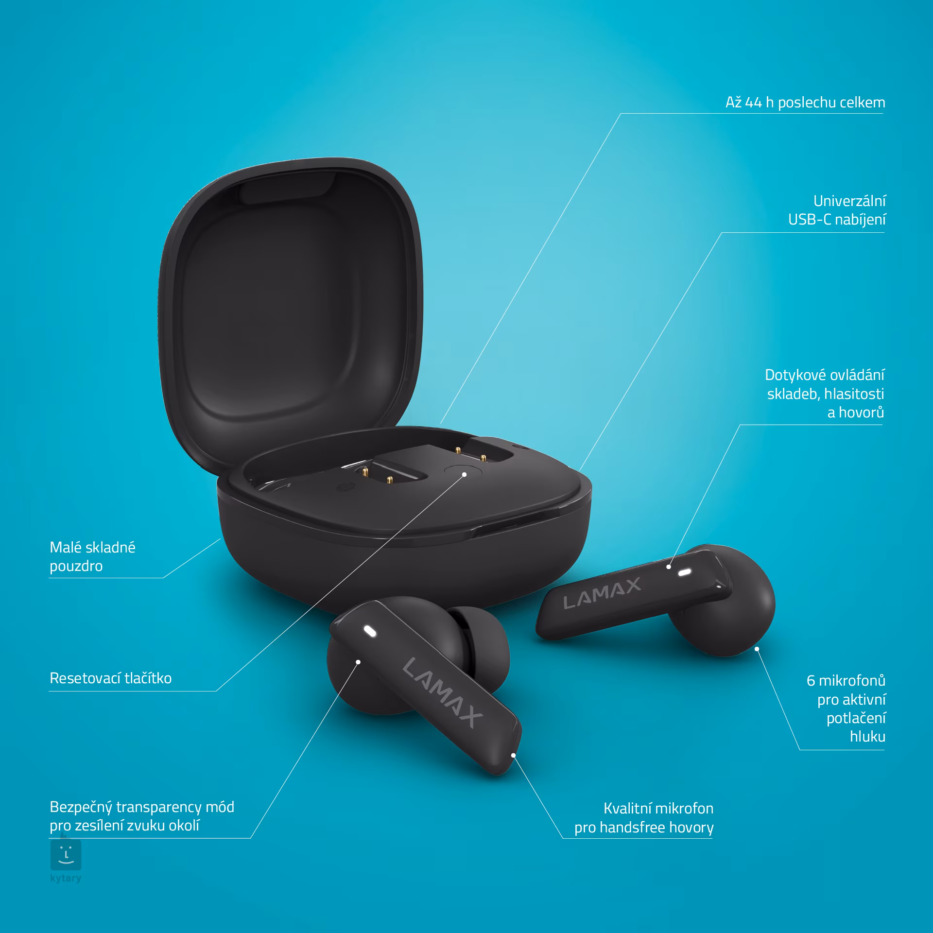 Mit den kabellosen In-Ear-Kopfhörern LAMAX Clips1 ANC können Sie der Realität des Alltags in Ihre eigene Welt entfliehen. Sie bieten bis zu 10 Stunden Akkulaufzeit (44 Stunden mit Ladecase), Bluetooth 5.3 mit einer Reichweite von bis zu 15 Metern, bis zu 40 dB Umgebungsgeräuschunterdrückung (ANC) dank dreier spezieller Mikrofone in jeder Hörmuschel, einen Transparenzmodus, bei dem die Mikrofone die Umgebungsgeräusche ausblenden, damit Sie sich in der Stadt bewegen und aufmerksam bleiben können, intuitive Touch-Bedienung, Gamer-Modus, kristallklarer Klang mit der LAMAX BeatBass-Technologie, die mit dem Hightech-Codec AAC verbessert wurde, hochwertige Mikrofone, USB-C-Ladefunktion, Schweiß- und Feuchtigkeitsresistenz sowie Unterstützung für die Sprachassistenten Siri und Google Assistant.
