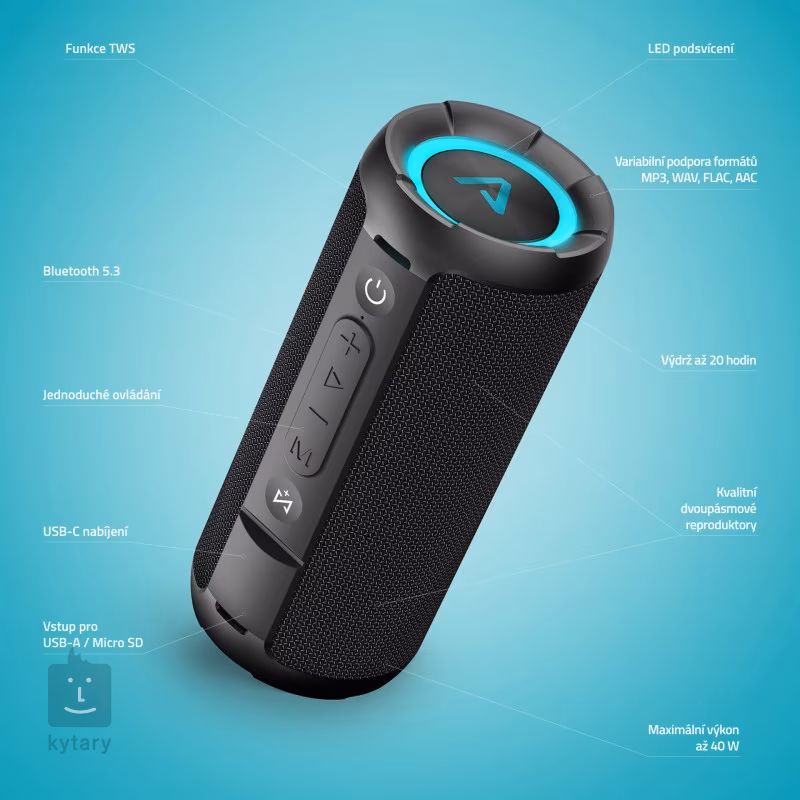 Sein fantastisch klarer und ausgewogener 40-W-Dual-Band-Sound wird Sie nicht enttäuschen, und wenn Sie sich einmal nach einem Stereo-Soundsystem sehnen, können Sie dank der TWS-Funktion problemlos einen kleinen Bruder kaufen und das Soundsystem zu zweit betreiben. Aber auch mit einem werden Sie viel Spaß haben und können sich auf 20 Stunden Akkulaufzeit, eine tolle Hintergrundbeleuchtung und ein wasserdichtes Design dank IPX5-Schutz verlassen. Dank des neuesten Bluetooth 5.3 gibt es keine Probleme mit dem Pairing, aber der SoundJam1 spielt auch die USB-Sticks deines Vaters oder Titel von einer SD-Karte oder über den analogen Aux-Eingang ab. Sehr gut. Die Stromversorgung erfolgt über USB-C.