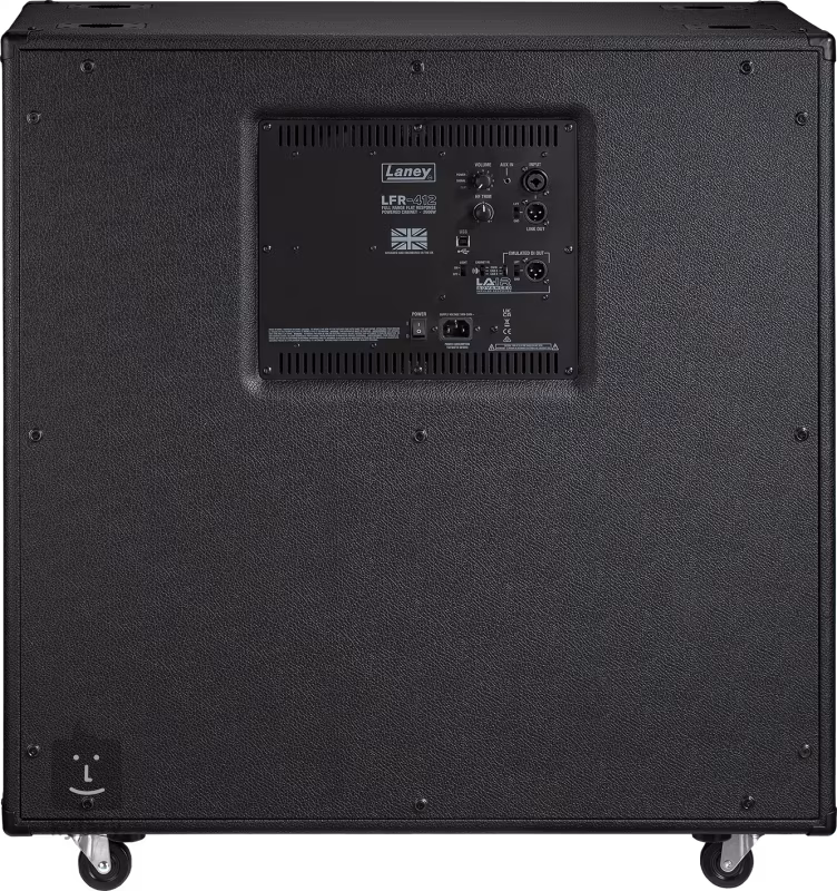 Auf der Rückseite befinden sich ein kombinierter XLR/Klinken-Eingang (6,3 mm) mit Lautstärkeregler und LED-Übersteuerungsanzeige, ein Hochfrequenztreiber (HF Trim) zur Anpassung der Box an die Umgebung und ein XLR-Line-Ausgang mit schaltbarer Masse, USB-B-Schnittstelle für den Zugriff auf LFR-412 IR-Presets und Cab EQ (herunterladbar von der LA∙IR LFR-App), symmetrischer XLR-DI-Ausgang mit umschaltbarem Cab IR (FRFR, Cab A, Cab B), Aux-In-Eingang für externe Audioquellen und schaltbare LED-Hintergrundbeleuchtung auf der Frontplatte.