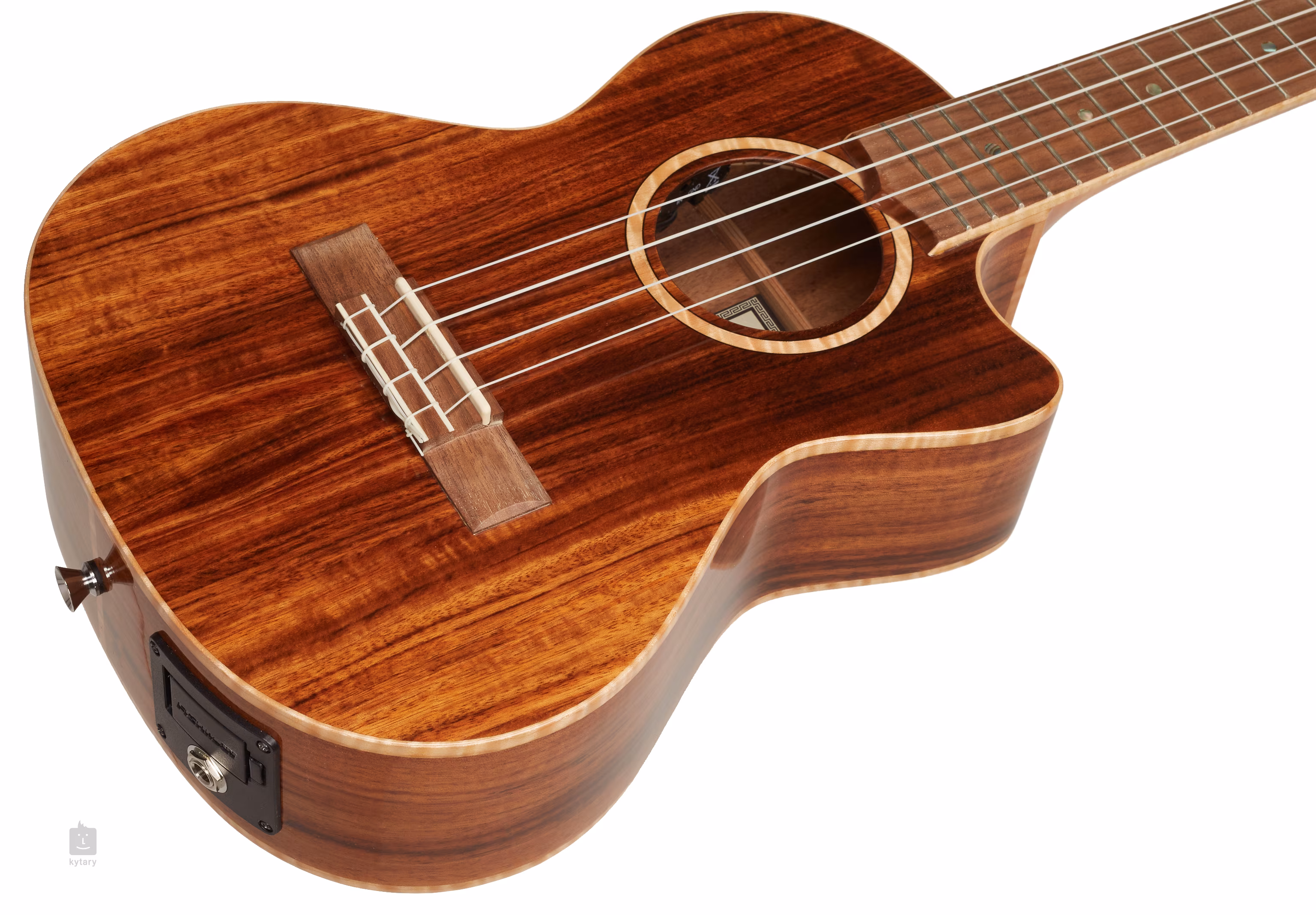 Der vollmassive Korpus dieser Tenor-Ukulele besteht aus Akazienholz, das dem Instrument einen ausgewogenen, warmen Ton mit guter Tonprojektion und Sustain verleiht. Das Griffbrett aus Walnussholz ist mit siebzehn Bünden ausgestattet, die mit Positionsmarkierungen versehen sind, um die Orientierung zu erleichtern. Der breitere Hals des Instruments und der Nullbund bieten einen komfortablen Sitz und eine gute Beweglichkeit des Griffbretts, während der NuBone XB-Sattel und der Nullbund für ein gutes Saitensustain sorgen. Die Stimmstabilität wird durch die hochwertige Deluxe Grover Open-Cock-Mechanik mit verchromten Stiften gewährleistet. Der optische Eindruck wird durch die Rosette und das Binding aus gemasertem Ahorn unterstrichen, die einen schönen Kontrast zur Akazienfarbe bilden. Die Ukulele wird in einem Softcase mit Schaumstoffpolsterung geliefert.