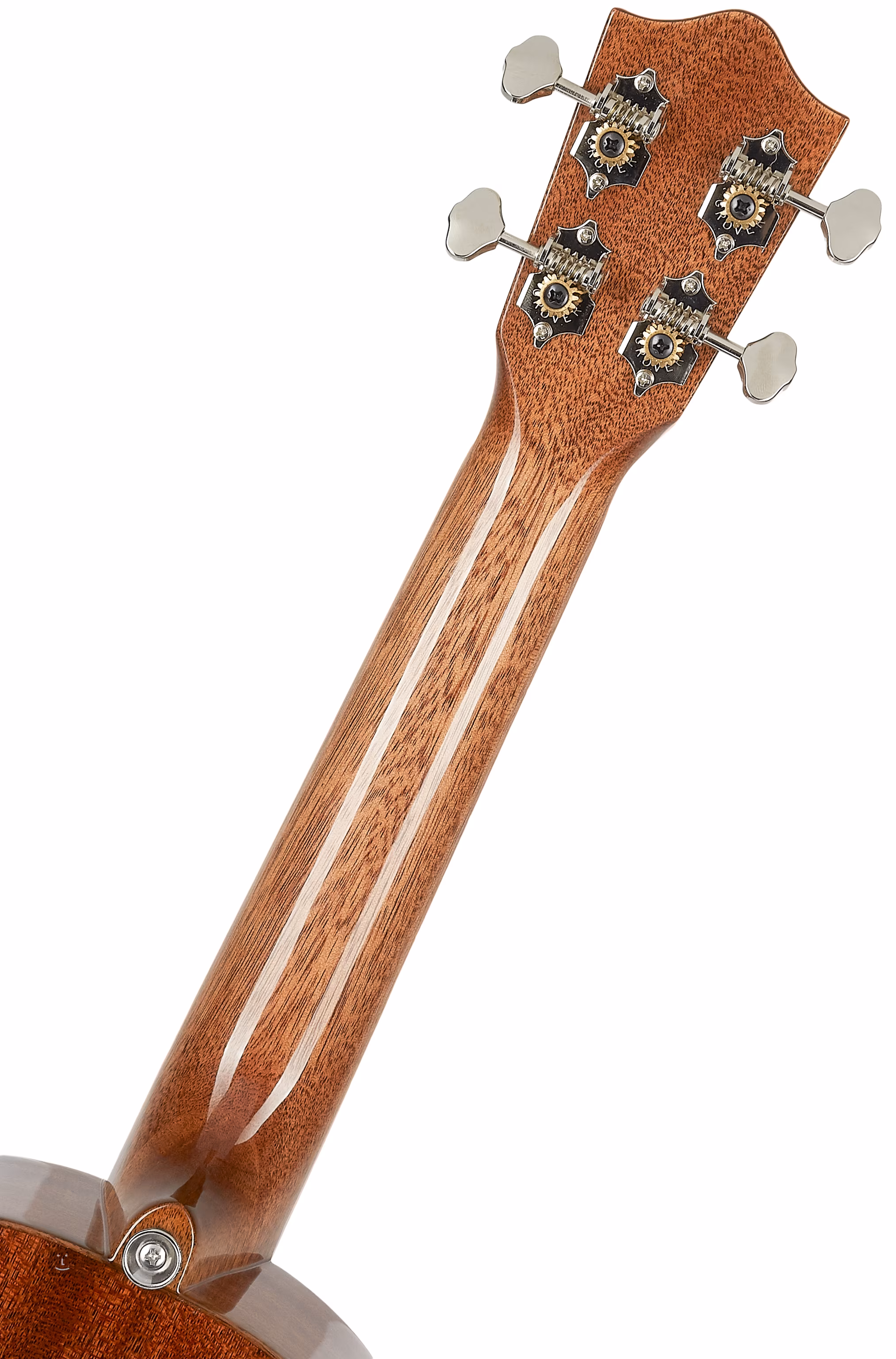 Der vollmassive Korpus dieser Konzert-Ukulele ist aus Mahagoni gefertigt, was dem Instrument einen vollen, warmen Ton mit guter Tonprojektion und Sustain verleiht. Das Griffbrett aus Walnussholz ist mit achtzehn Bünden ausgestattet, und die Positionsmarkierungen erleichtern die Orientierung. Der breitere Hals des Instruments und der Nullbund bieten einen komfortablen Sitz und eine gute Beweglichkeit des Griffbretts, während der NuBone XB-Bund und -Sattel den Saiten ein gutes Sustain verleihen. Die Stimmstabilität wird durch die hochwertige Deluxe Grover Open-Cock-Mechanik mit verchromten Stiften gewährleistet. Der optische Eindruck wird durch die Rosette aus gemasertem Ahorn und das eingelegte Walnuss-Binding verstärkt, die einen schönen Kontrast zur Mahagonifarbe bilden. Die Ukulele wird in einem Softcase mit Schaumstoffpolsterung geliefert.