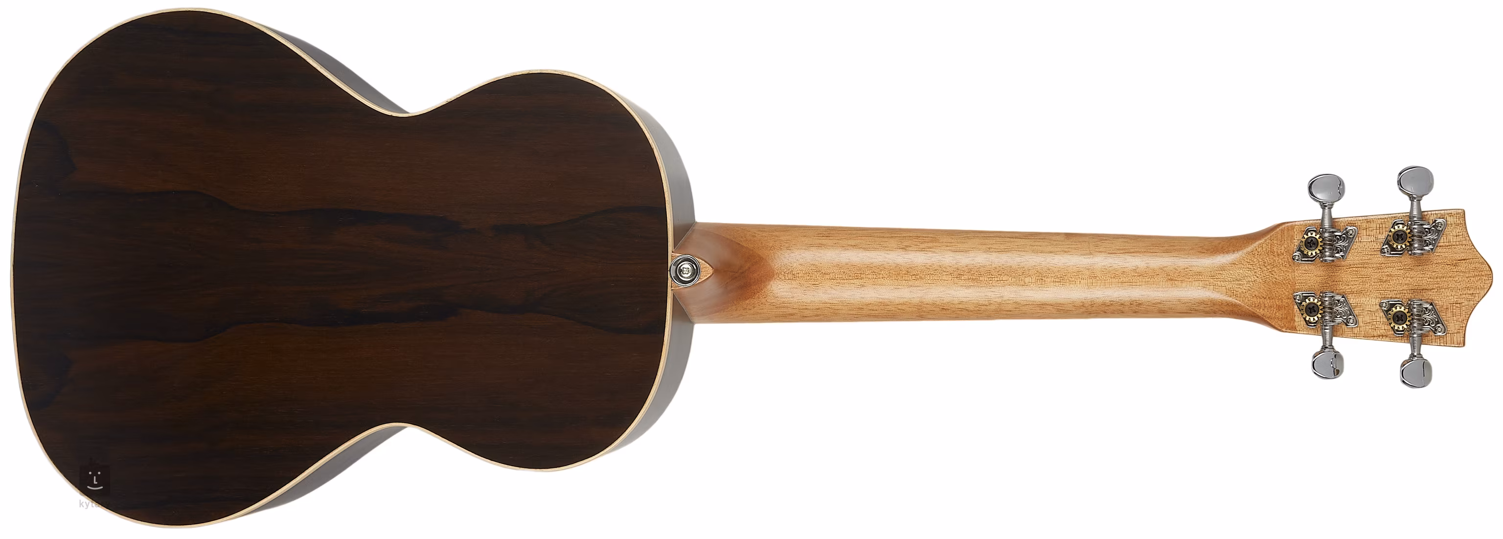Der Korpus dieser Tenor-Ukulele ist aus überlagerndem Ziricote-Holz gefertigt, das dem Instrument neben seiner beeindruckenden Optik einen warmen Ton mit dunklerer Färbung verleiht. Das Griffbrett aus Walnussholz ist mit siebzehn Bünden ausgestattet, die mit Positionsmarkierungen versehen sind, um die Orientierung zu erleichtern. Der breitere Hals des Instruments und der Nullbund bieten ein angenehmes Griffbrettgefühl und eine gute Beweglichkeit, während der NuBone XB-Sattel und der Nullbund für ein gutes Saitensustain sorgen. Die Stimmstabilität wird durch die hochwertige, offen verchromte Mechanik gewährleistet. Der optische Eindruck wird durch die Ahornrosette und das Binding (Korpus und Griffbrett) akzentuiert, die einen schönen Kontrast zur Farbe des Ziricote-Holzes bilden. Die Ukulele wird mit einem Gigbag mit 10 mm dicker Polsterung geliefert.