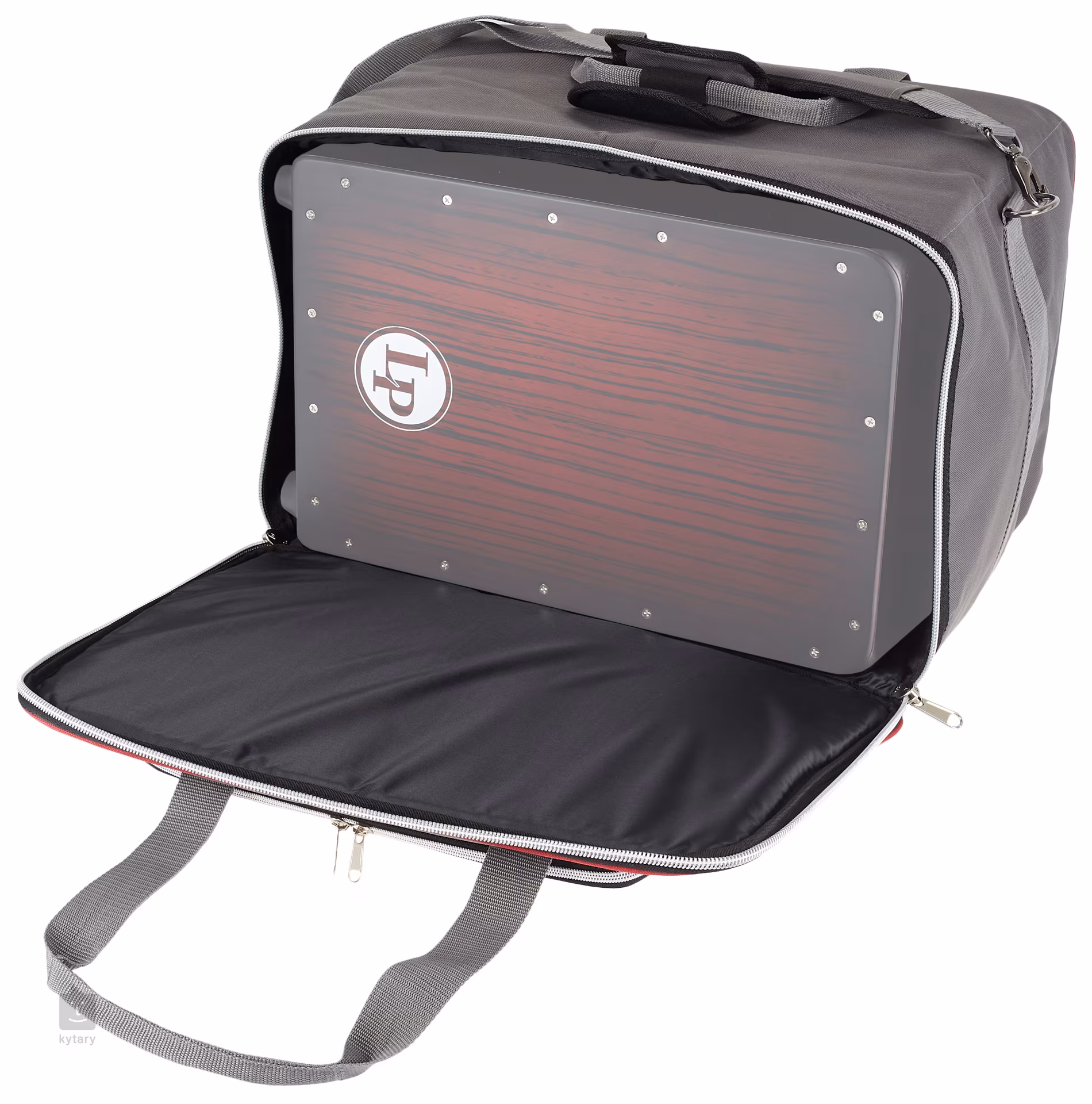 Stabiler, gepolsterter Cajon-Koffer mit Reißverschlusstaschen, praktischen Griffen und Schultergurt.