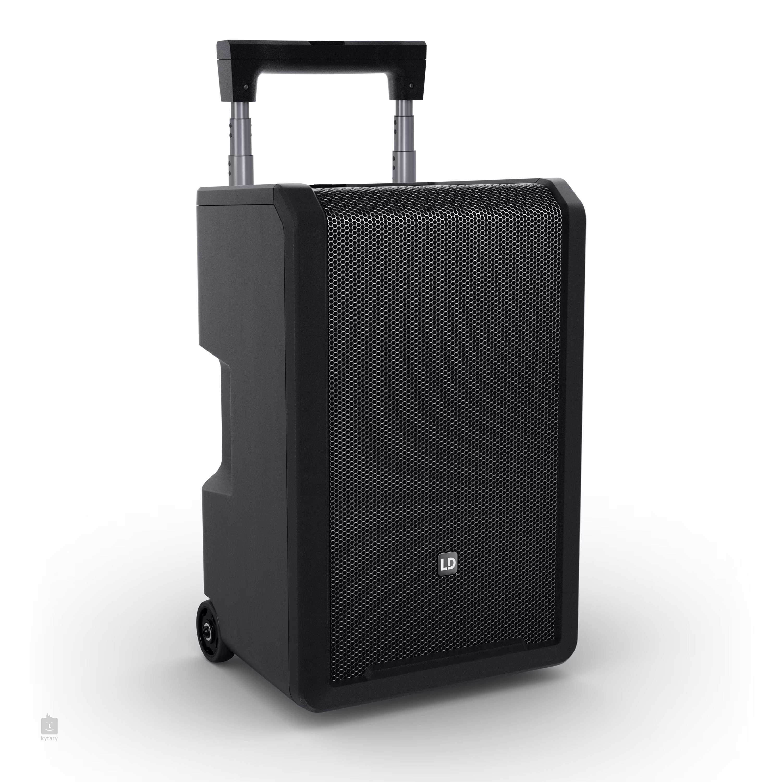 Einfach zu transportieren Wenn Sie häufig mit Ihrem ANNY 10 unterwegs sind, werden Sie die integrierten Räder und den Teleskopgriff zu schätzen wissen, mit denen Sie den ANNY wie einen normalen Reisekoffer behandeln können. Die robuste Konstruktion, die beiden Griffe und die praktische Abschrägung sorgen dafür, dass der ANNY 10 nicht nur äußerst strapazierfähig ist, sondern sich auch für den Einsatz auf dem Boden oder auf einem Lautsprecherständer eignet.