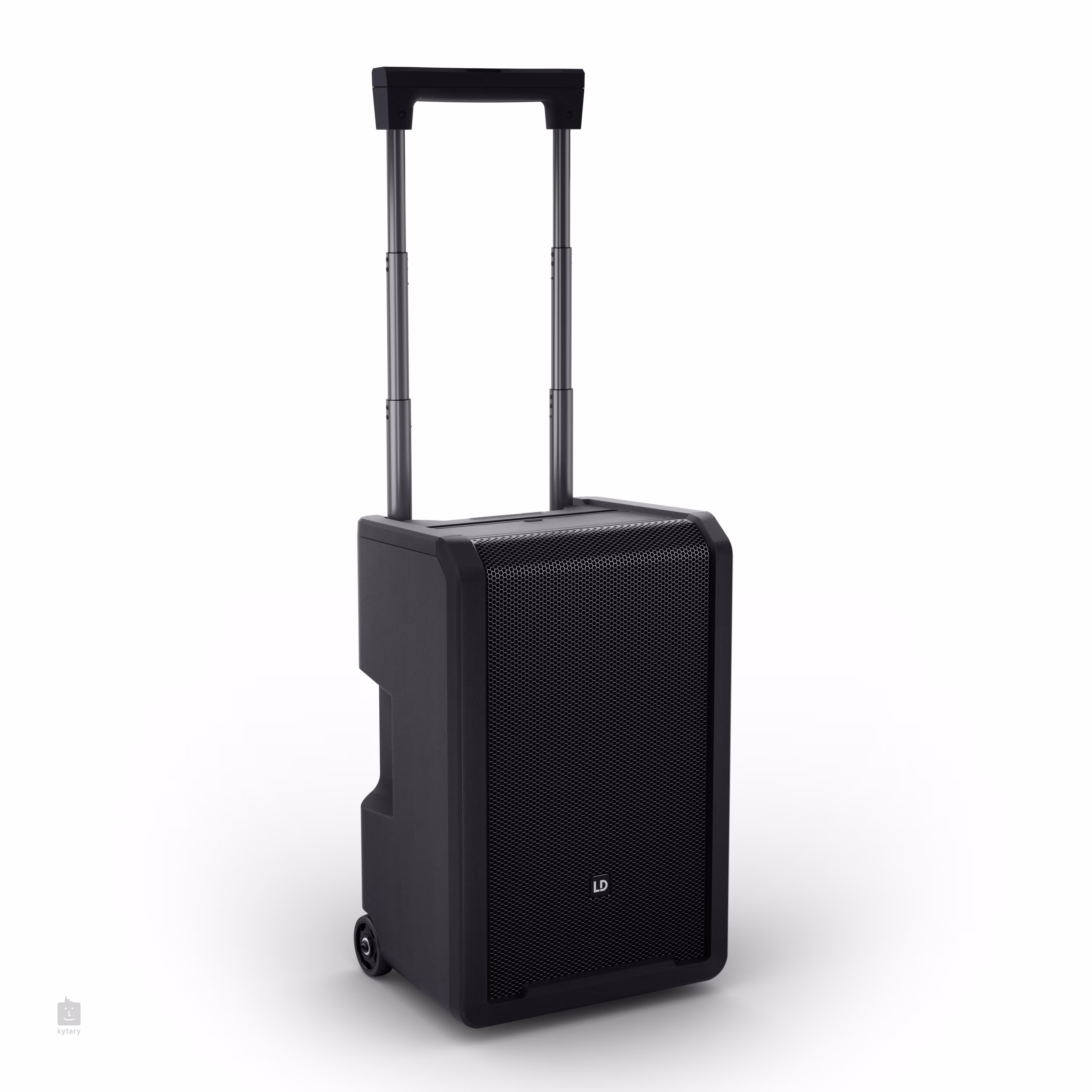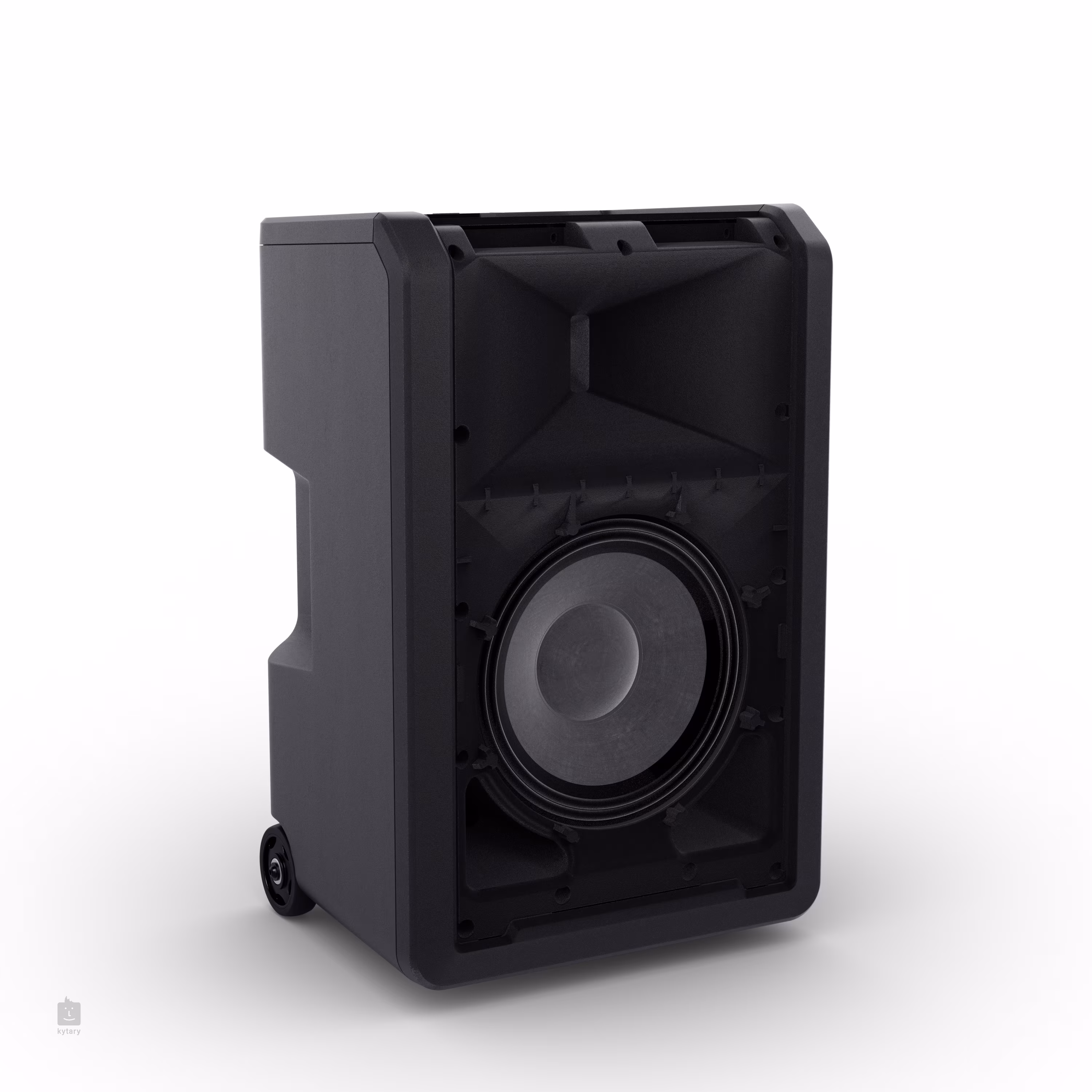Einfach zu transportieren Wenn Sie häufig mit Ihrem ANNY 10 unterwegs sind, werden Sie die integrierten Räder und den Teleskopgriff zu schätzen wissen, mit denen Sie den ANNY wie einen normalen Reisekoffer behandeln können. Die robuste Konstruktion, die beiden Griffe und die praktische Abschrägung sorgen dafür, dass der ANNY 10 nicht nur äußerst strapazierfähig ist, sondern sich auch für den Einsatz auf dem Boden oder auf einem Lautsprecherständer eignet.