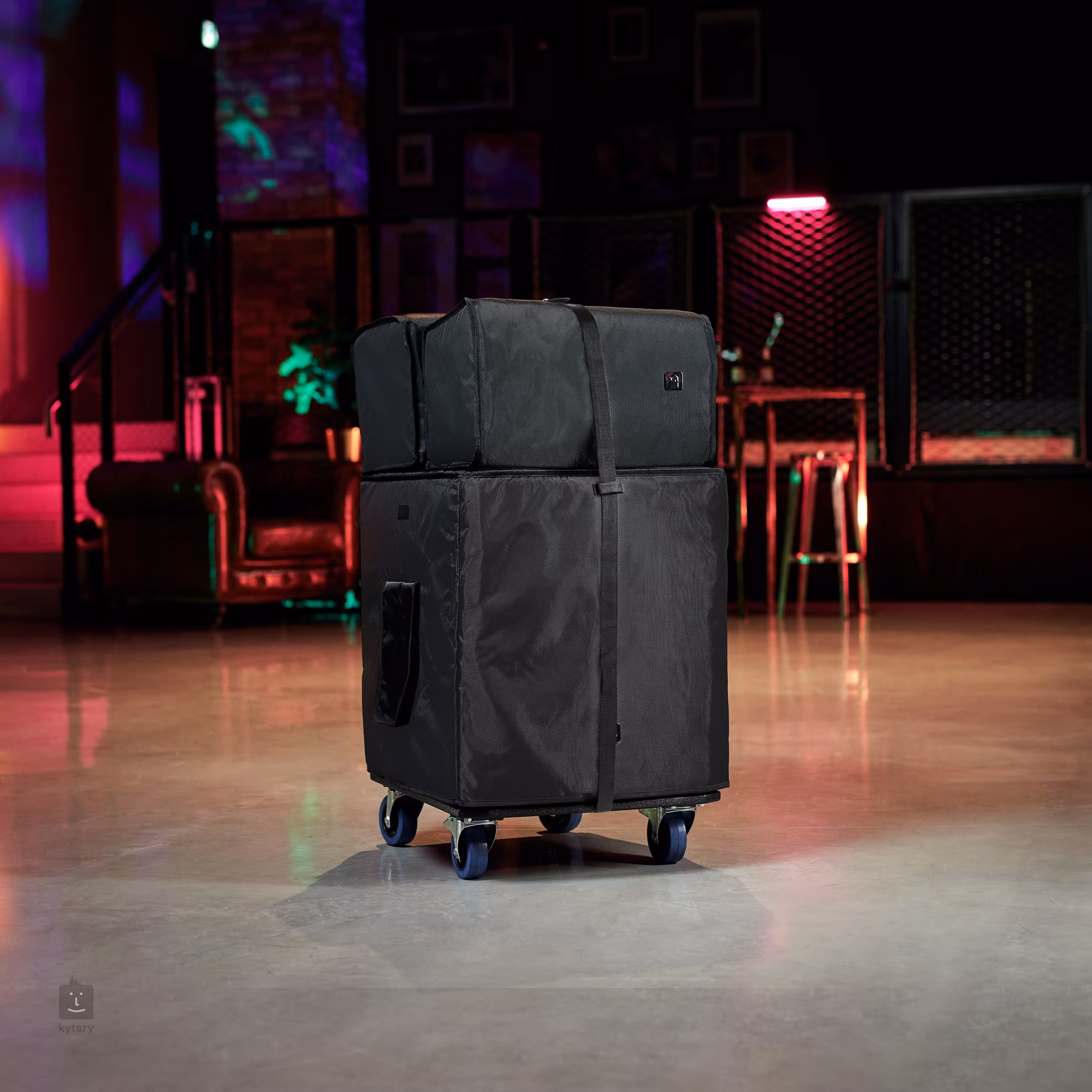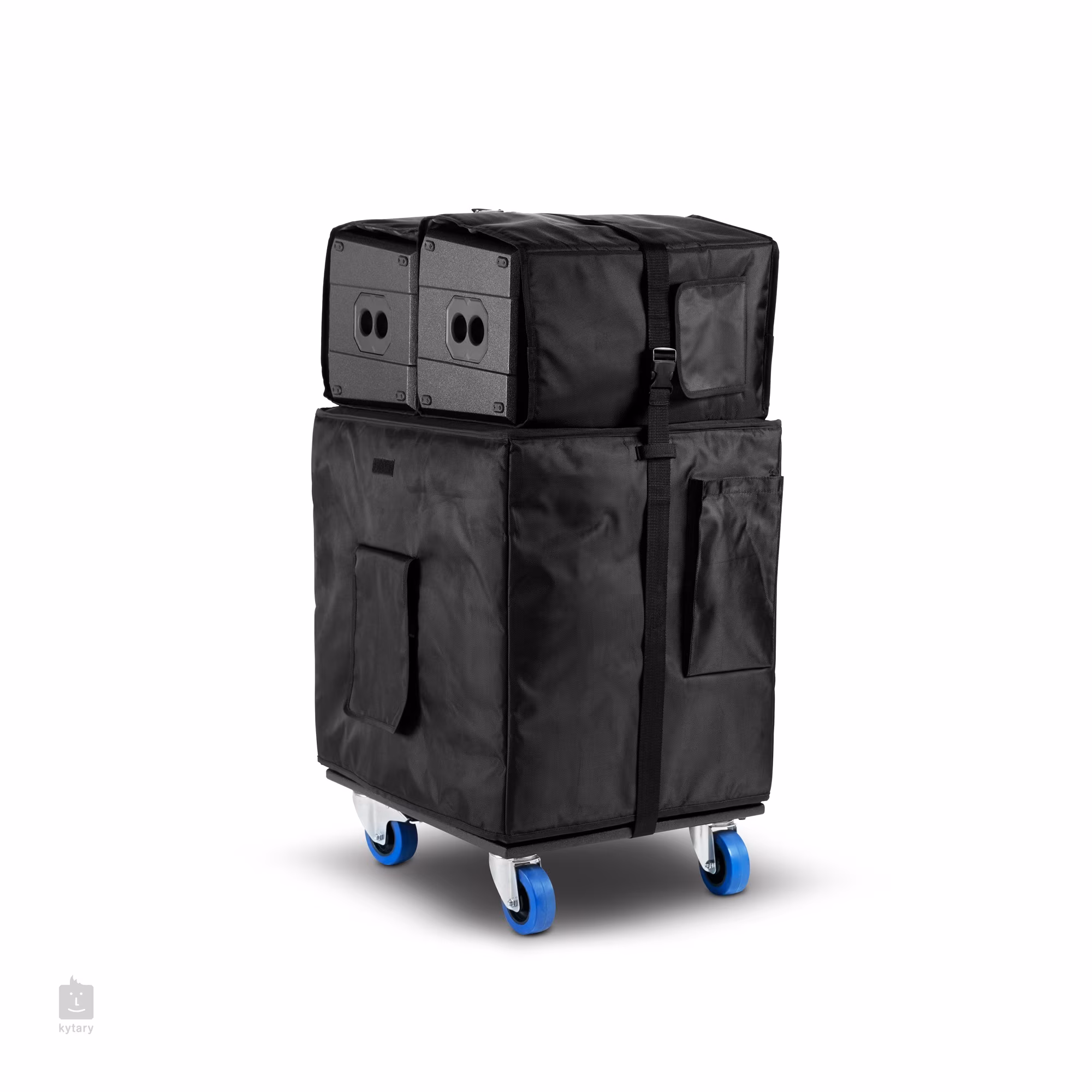 Set von gepolsterten Transportkoffern für das komplette LD Systems DAVE 15 G4X Soundsystem. Das Set besteht aus einer Plattform mit Rädern aus 18 mm starkem Birkensperrholz mit Polyurethanbeschichtung, einem Subwoofer-Koffer mit Außentasche für kleines Zubehör, zwei Satellitenkoffern und einem Gurt. Die Räder haben einen Durchmesser von 80 mm und zwei von ihnen sind gebremst.