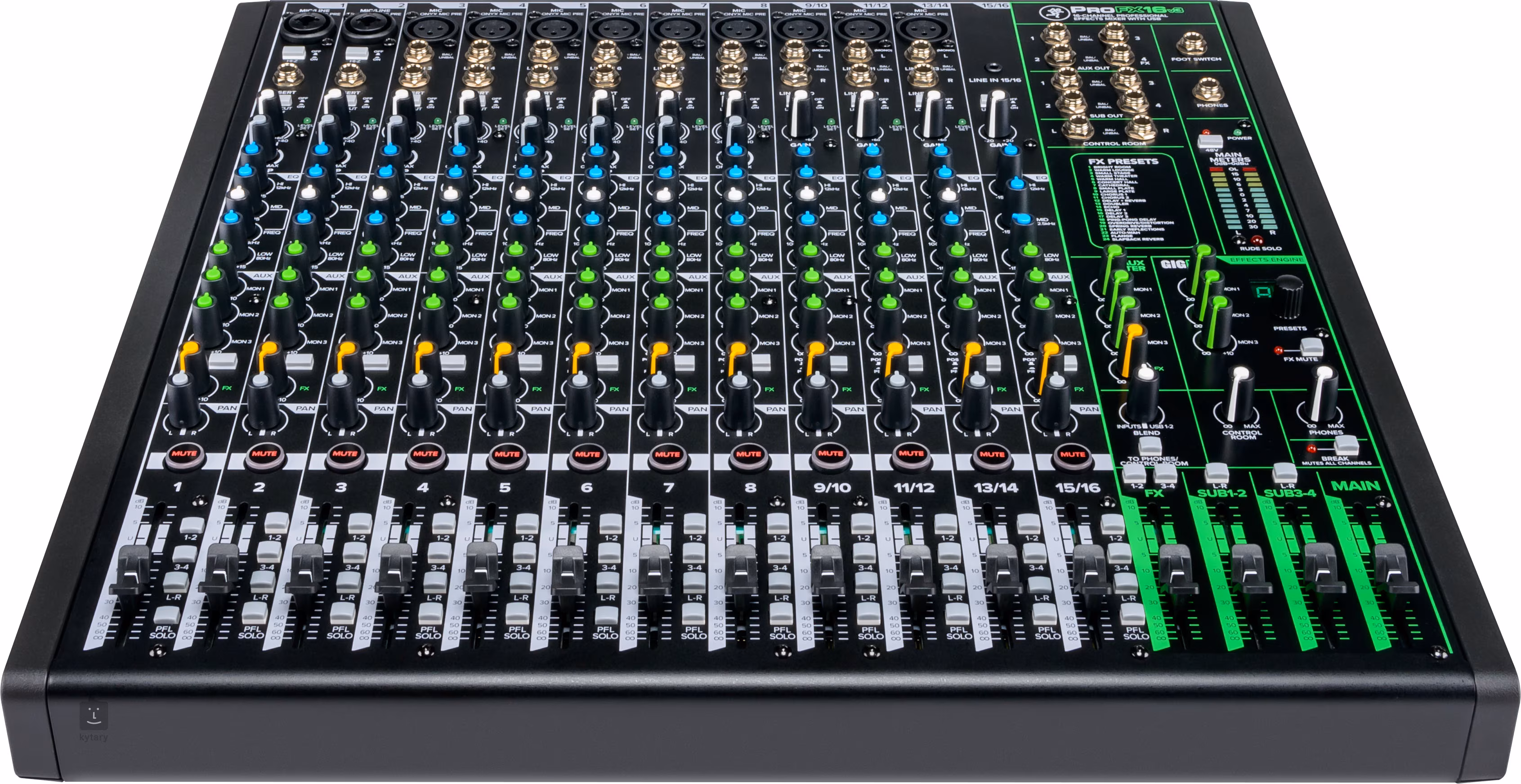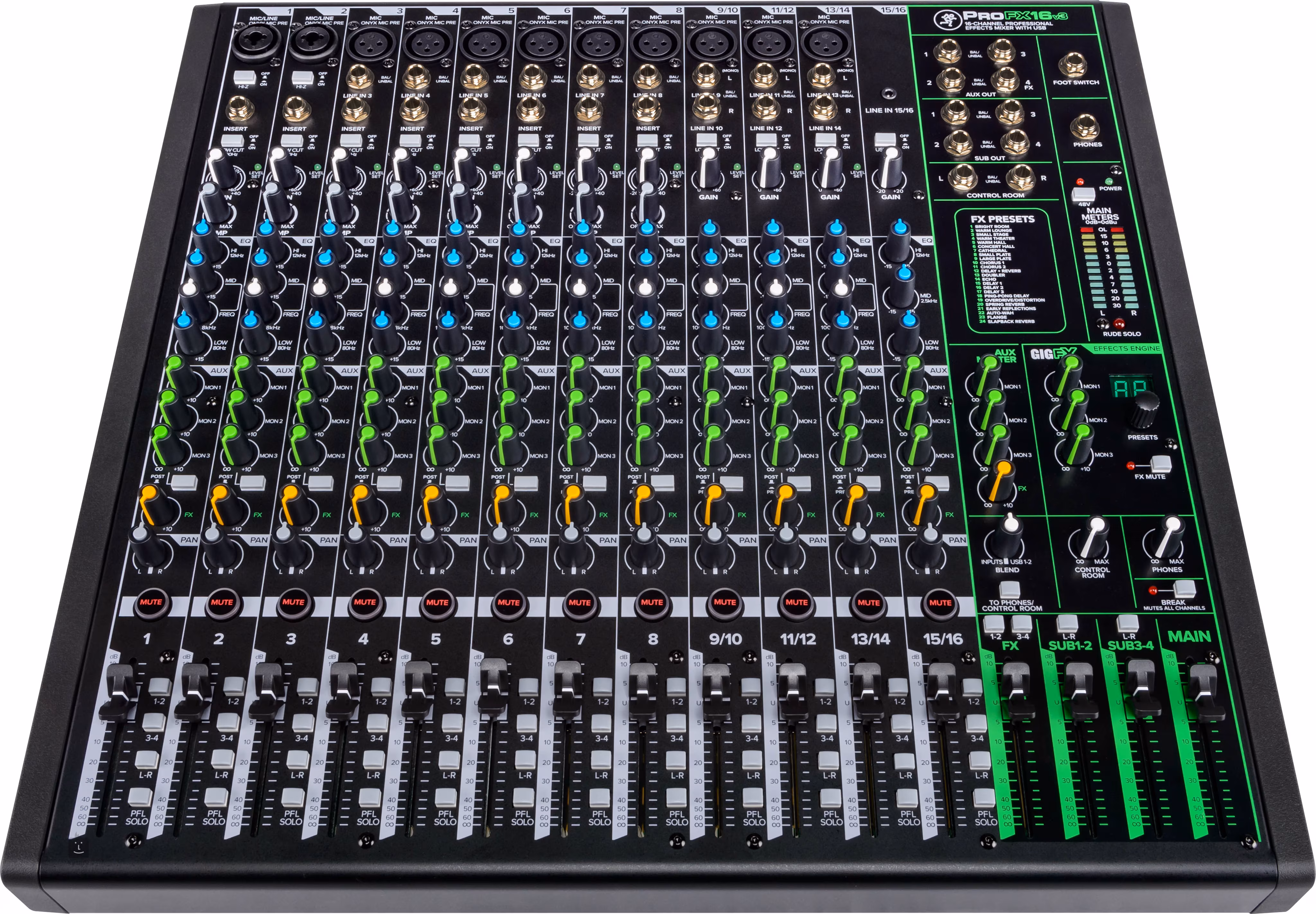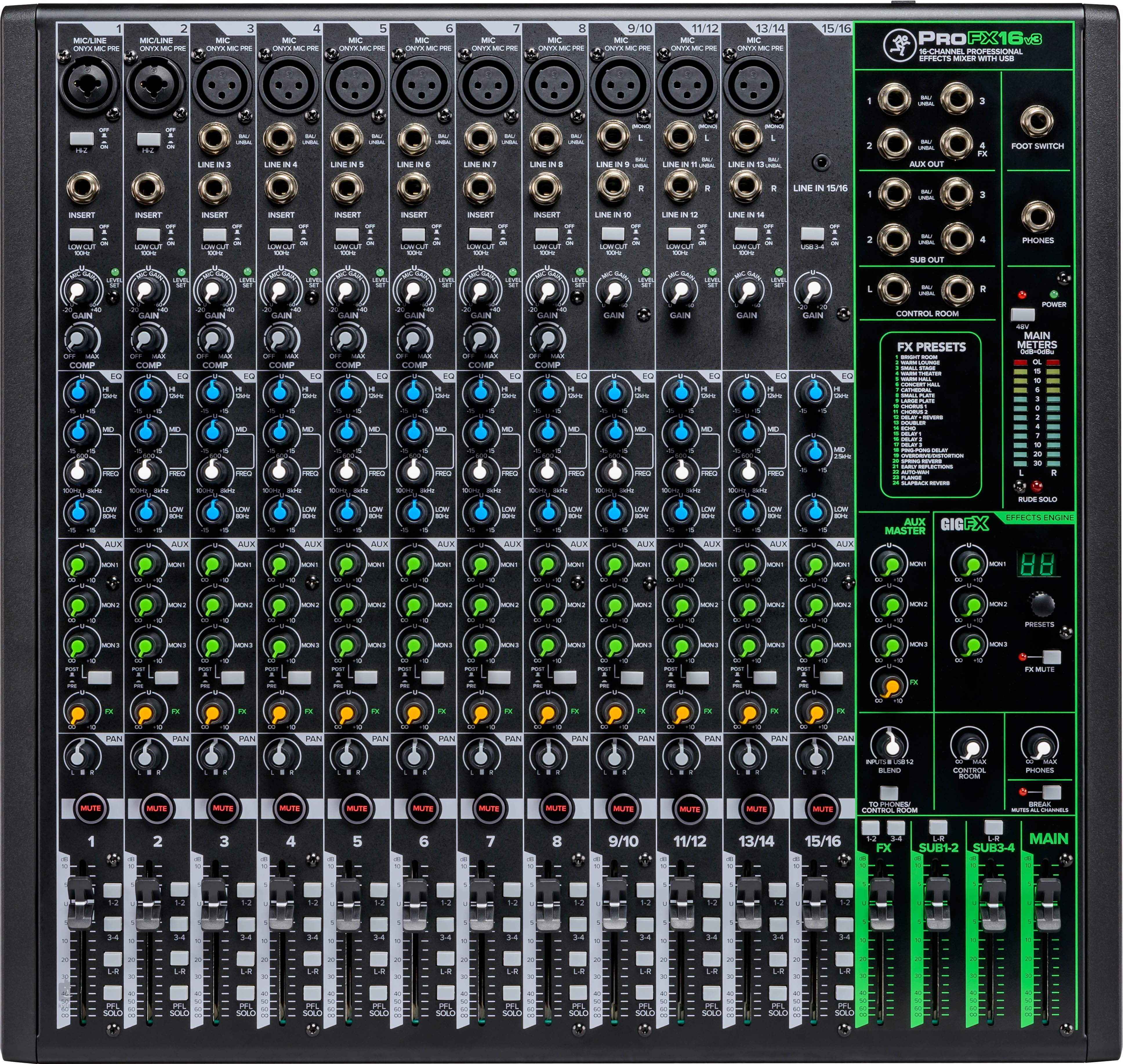 Das ProFX16v3 ist ein sechzehnkanaliges Mischpult mit elf Onyx-Vorverstärkern und einer GigFX-Sound-Engine. Der Sound kann über intuitive Bedienelemente und einen Dreiband-EQ auf jedem Kanal eingestellt werden. Neben zwei Combo XLR/Klinke-Eingängen verfügt das Pult über einen Hi-Z-Eingang für den direkten Anschluss von Gitarre/Bass, neun XLR/Stereo-Klinke-Eingänge und einen Line IN für einen Musikplayer oder ein mobiles Gerät. Außerdem gibt es einen Monitorausgang, einen Hauptausgang, einen Kopfhörerausgang und einen Fußschaltereingang.