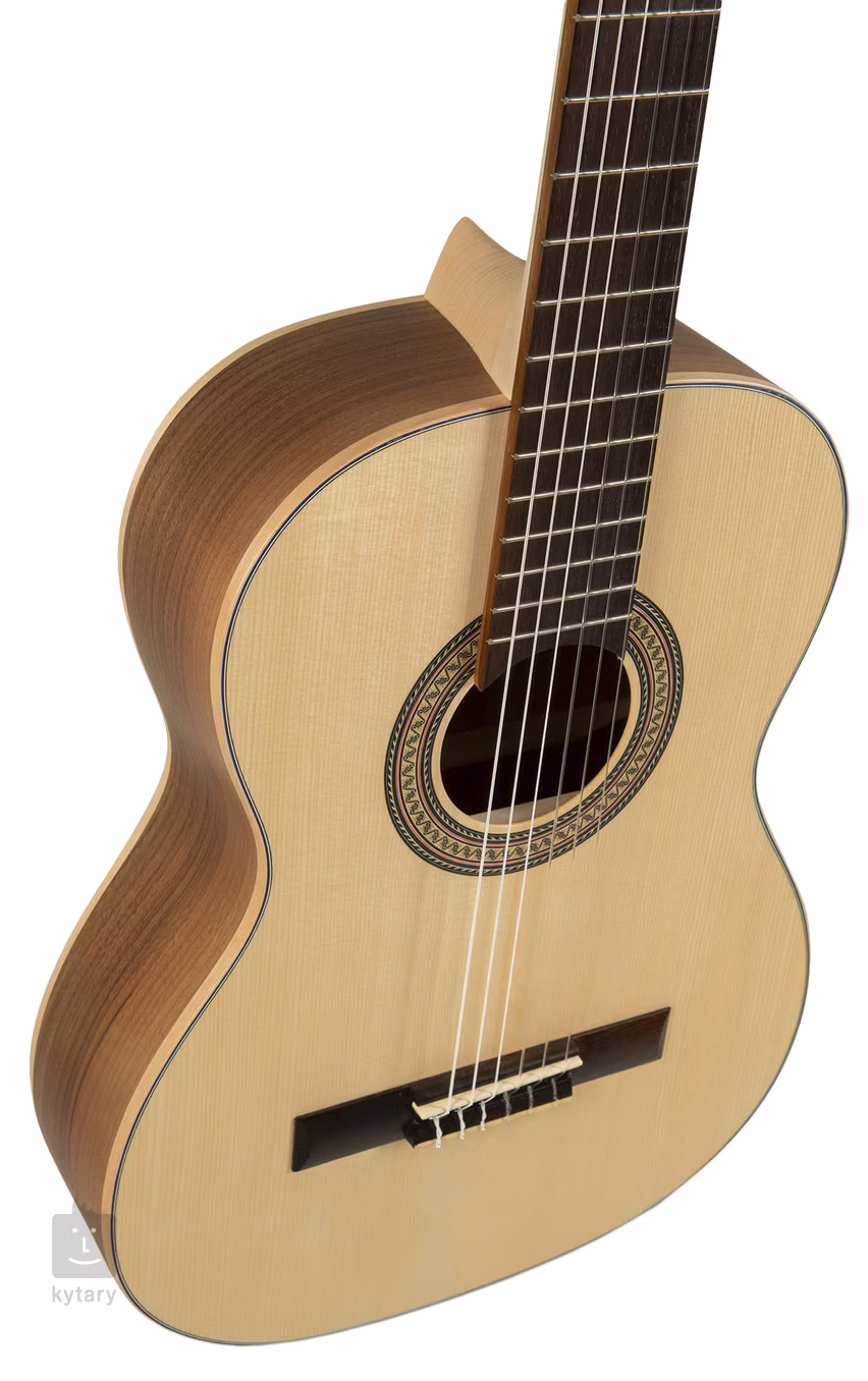 ECOLOGÍA Serie E-62 7/8 Größe "Senorita" ist eine klassische Gitarre in 7/8 Größe. Die Vorderseite des Instruments ist aus massiver Fichte, Boden und Zargen sind aus laminiertem Nussbaum. Die Gitarre verfügt außerdem über einen Ahornhals, ein Akaziengriffbrett, eine Nullbund- und Griffbretteinlage aus synthetischem Bonoid-Material mit hohem Glasanteil (ähnlich dem TusQ-Material), in den Niederlanden hergestellte Van-Gent-Stimmmechaniken mit schwarzen Wirbeln und traditionelle Elemente in Form von Ahorn-Korpuseinfassung, Zierrosette und Walnussfurnier an der Kopfplatte.
