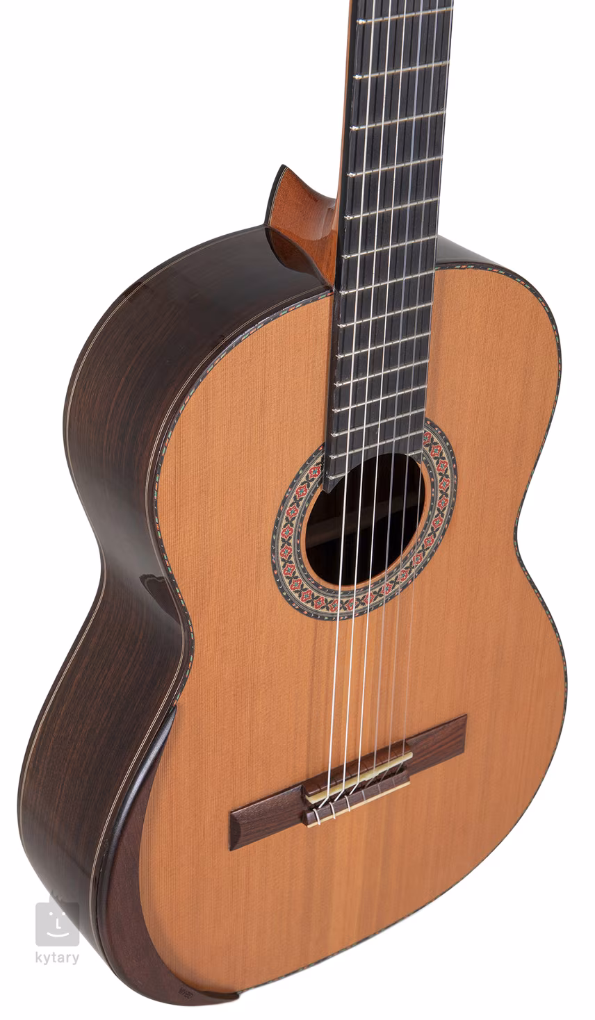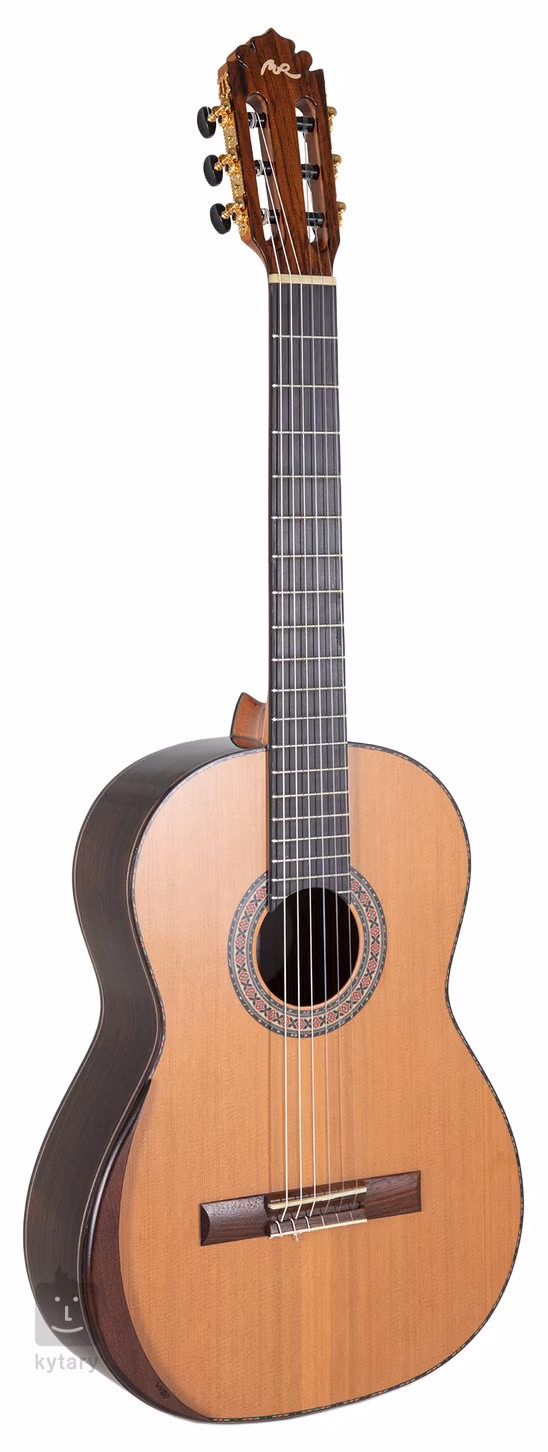 MAGISTRAL Serie F ind. Rosewood all solid ist eine klassische Gitarre in voller 4/4 Größe. Die Vorderseite ist aus roter Zeder gefertigt, während Boden und Zargen aus indischem Palisander bestehen. Die Gitarre verfügt außerdem über einen Zedernhals mit Ebenholzbeleistung, ein Ebenholzgriffbrett, ein Palisandergriffbrett mit zwölf Löchern, ein Griffbrett aus Knochen, vergoldete Lyra-Mechaniken mit schwarzen Wirbeln, eine praktische Armlehne für mehr Spielkomfort sowie traditionelle Elemente in Form eines Holzkorpus-Schlagbretts und einer dekorativen Rosette.