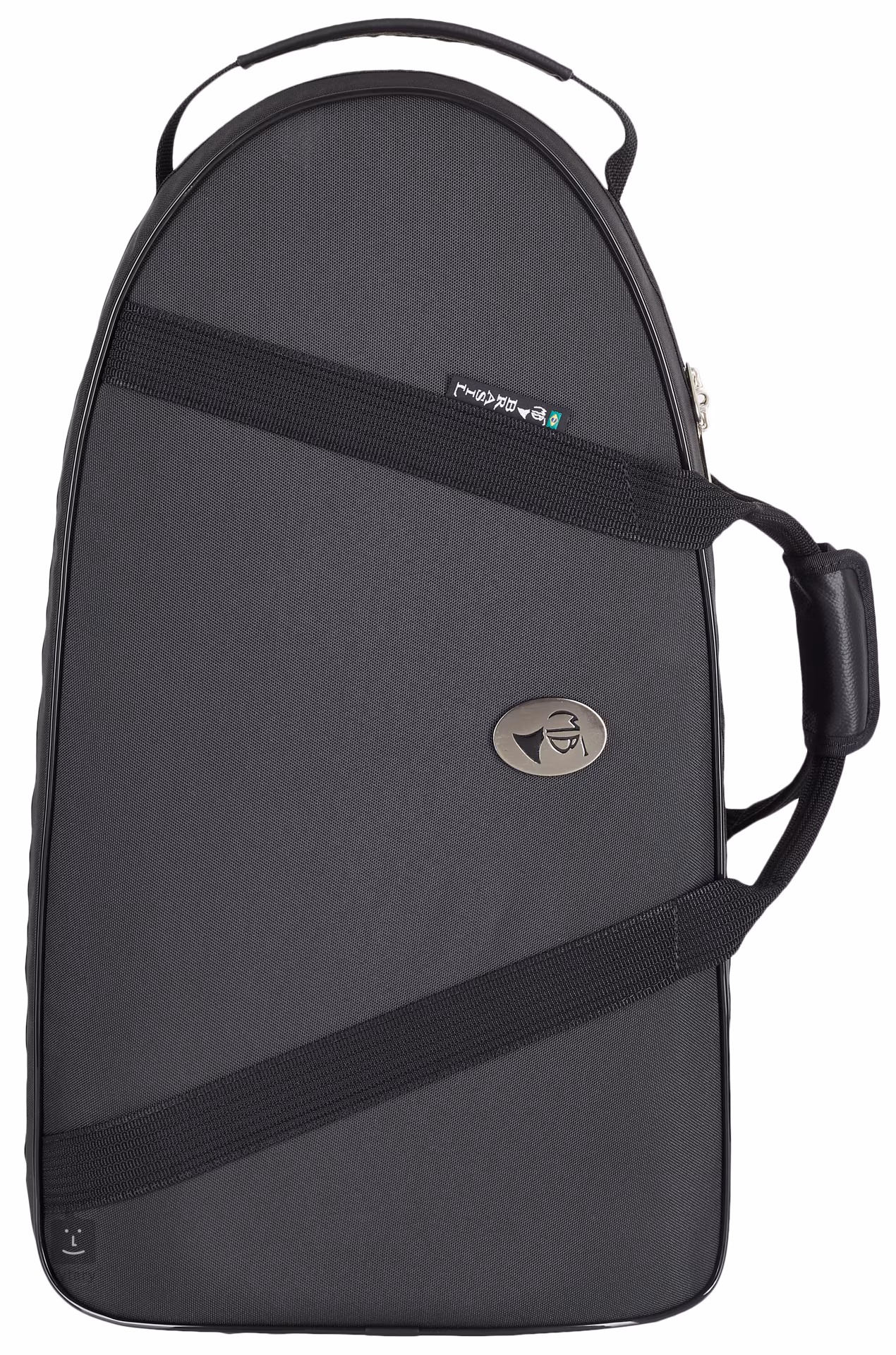 Gehäuse für Flügelhorn mit Drehventilen (maximale Instrumentenlänge 45 cm, maximaler Resonanzboden-Durchmesser 17 cm). Die Glasfaser- oder Kohlefaserkonstruktion ist außen mit einer Nylonhülle und innen mit einem nylonbeschichteten Schaumstoff überzogen. Die Klettverschlüsse können verstellt werden, um die Werkzeuge genau in der gewünschten Position zu fixieren.