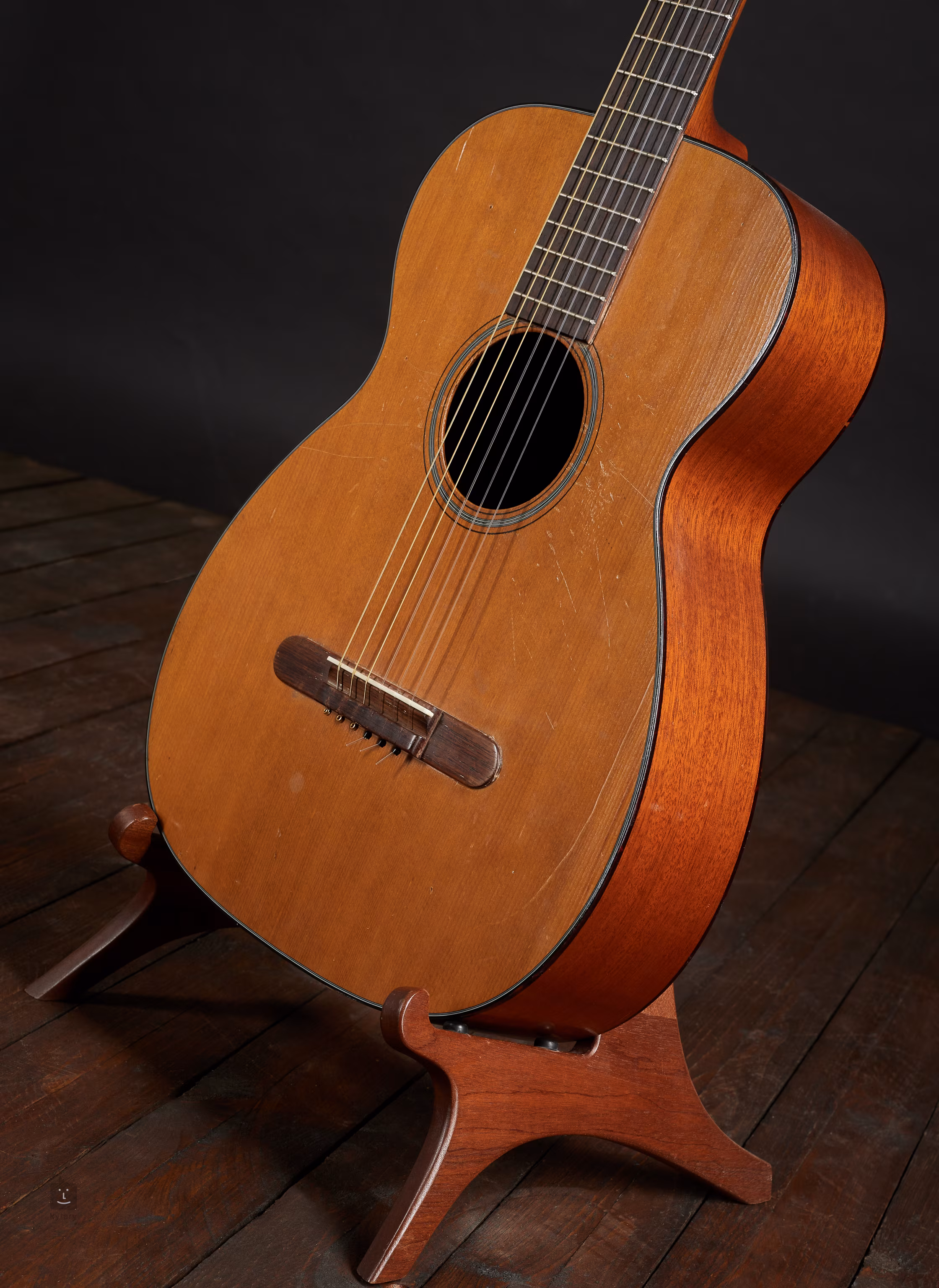 Das Instrument wurde einer Reihe von Reparaturen unterzogen, die seinem Alter entsprechen. Der Korpus wurde von dem dunklen Lack auf der Rückseite befreit, so dass Sie das Martin-Logo auf der Rückseite der Kopfplatte nicht mehr finden, aber glücklicherweise hat das Instrument auch im Inneren des Korpus eine Datierung und Identifizierung; auf der Unterseite des Balgs wurde ein neues Stück Holz ausgelegt und der umliegende Bereich mit schwarzer Farbe lackiert; das Griffbrett wurde bereits neu eingefasst; das Palisander-Griffbrett wurde neu gepresst; die Stimmmechaniken sind neuer.