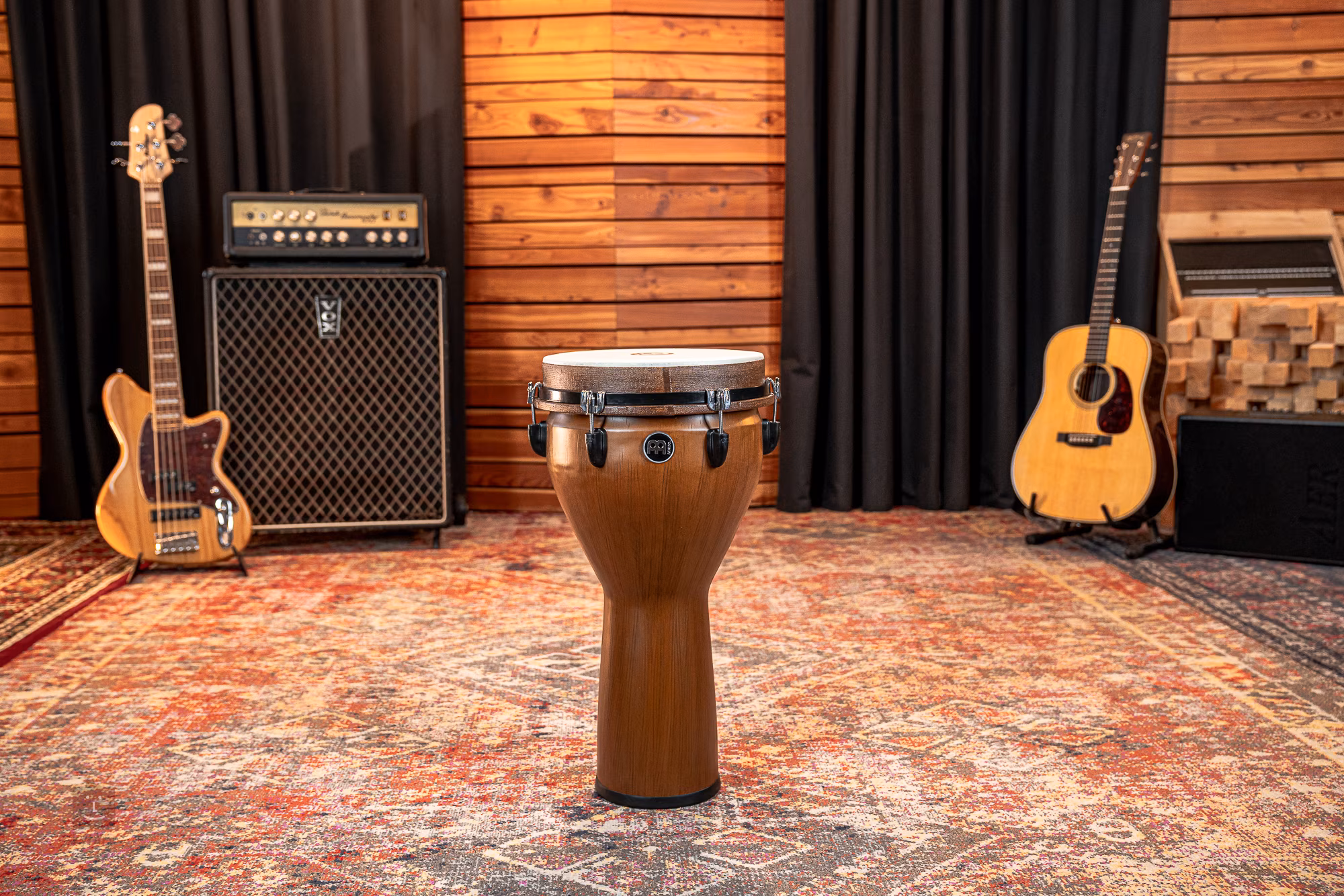 Wenn Sie eine wirklich hochwertige Djembe mit einem kraftvollen Klang suchen, die sich dank ihrer Langlebigkeit und ihres geringen Gewichts ideal für häufige Reisen eignet, sind Sie bei uns genau richtig. Diese Djembe aus der Meinl Jumbo-Serie ist aus einem leichten Kunststoff gefertigt, der nicht nur sehr haltbar und absolut wetterfest ist, sondern dem Instrument auch ein sehr breites Spektrum an Klangmöglichkeiten verleiht. Dazu trägt auch der größere Korpus bei, der dank seiner verbesserten Resonanzfähigkeit einen wirklich dicken Bass-Sound, aber auch scharfe und fokussierte Höhen oder Slap-Töne erzeugen kann. Die stabile und einfache Abstimmung wird durch die robuste Hardware gewährleistet, die auch für einen gleichmäßigen Klang sorgt.