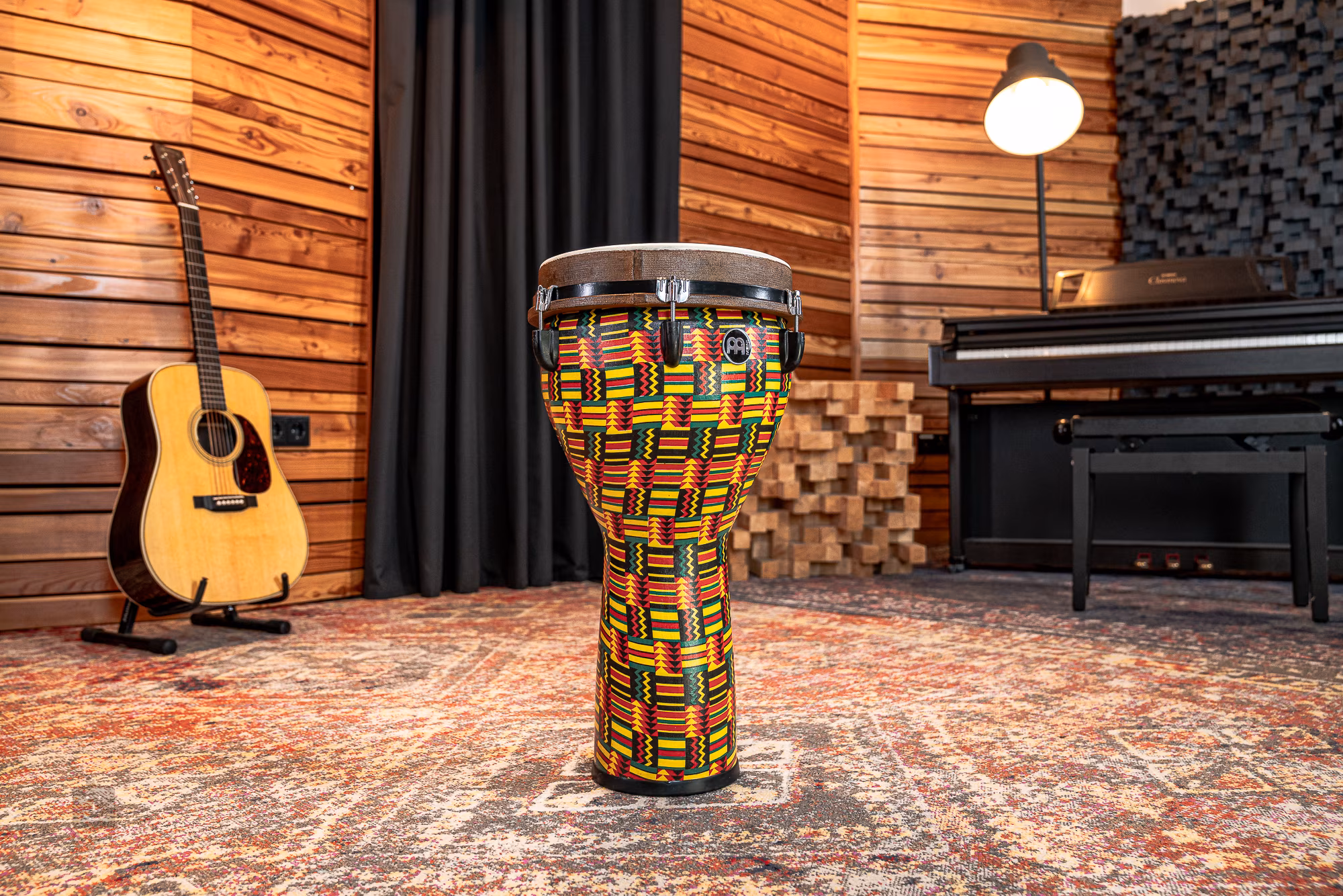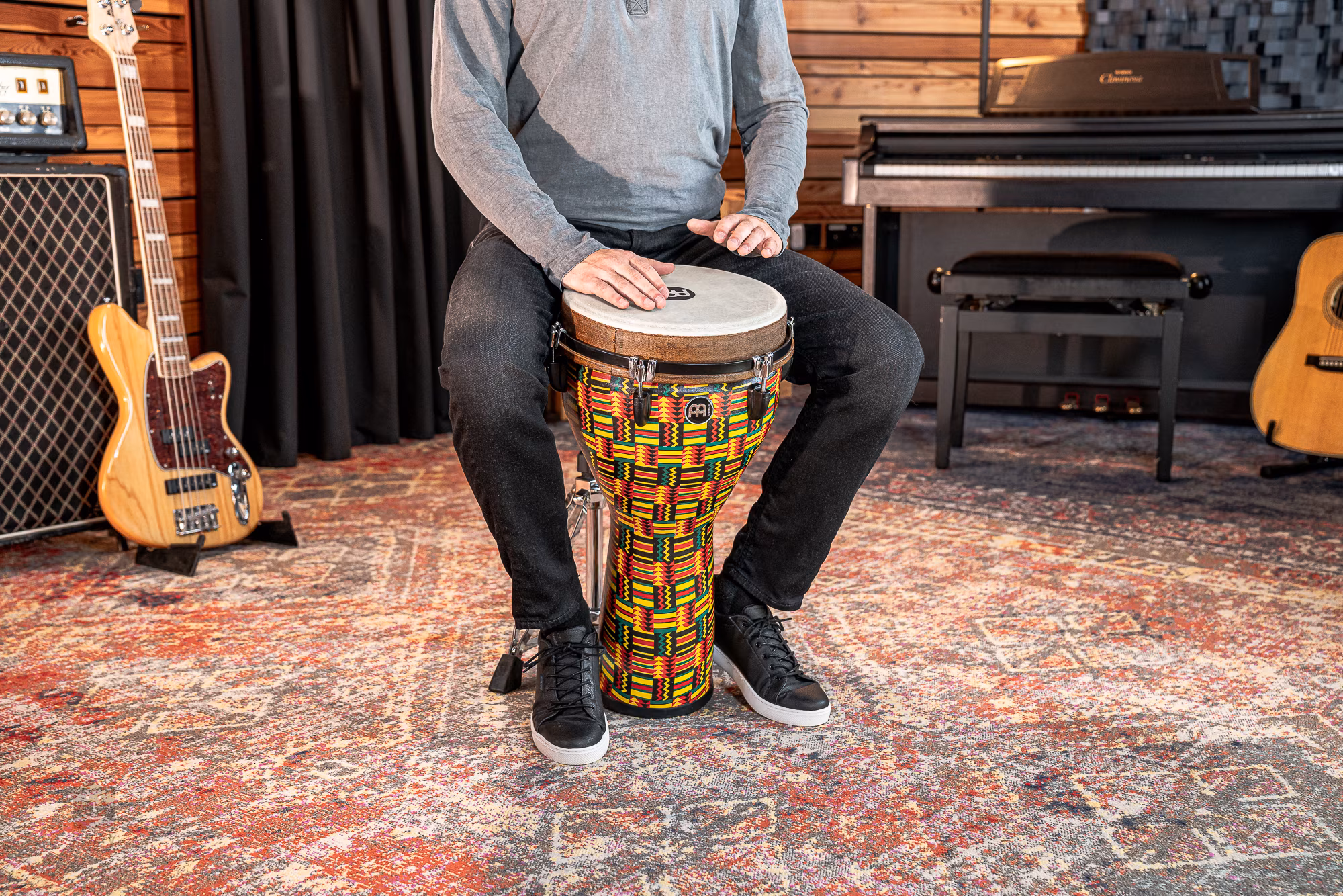 Wenn Sie eine wirklich hochwertige Djembe mit einem kraftvollen Klang suchen, die sich dank ihrer Langlebigkeit und ihres geringen Gewichts ideal für häufige Reisen eignet, sind Sie bei uns genau richtig. Diese Djembe aus der Meinl Jumbo-Serie ist aus einem leichten Kunststoff gefertigt, der nicht nur sehr haltbar und absolut wetterfest ist, sondern dem Instrument auch ein sehr breites Spektrum an Klangmöglichkeiten verleiht. Dazu trägt auch der größere Korpus bei, der dank seiner verbesserten Resonanzfähigkeit einen wirklich dicken Bass-Sound, aber auch scharfe und fokussierte Höhen oder Slap-Töne erzeugen kann. Die stabile und einfache Abstimmung wird durch die robuste Hardware gewährleistet, die auch für einen gleichmäßigen Klang sorgt. Dieses Modell zeichnet sich außerdem durch ein stilvolles Finish aus, das bestimmt nicht unbemerkt bleibt.