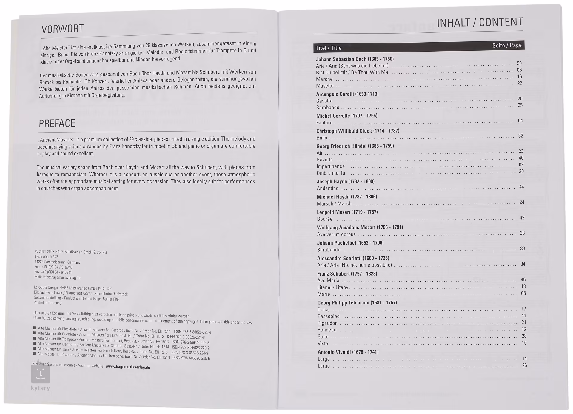 Ancient Masters enthält 29 bekannte Stücke der klassischen Musik (Barock, Klassik und Frühromantik) von Musikgrößen wie Bach, Haydn, Vivaldi, Mozart, Schubert und anderen, arrangiert für Trompete solo mit Begleitung für Klavier/Orgel.