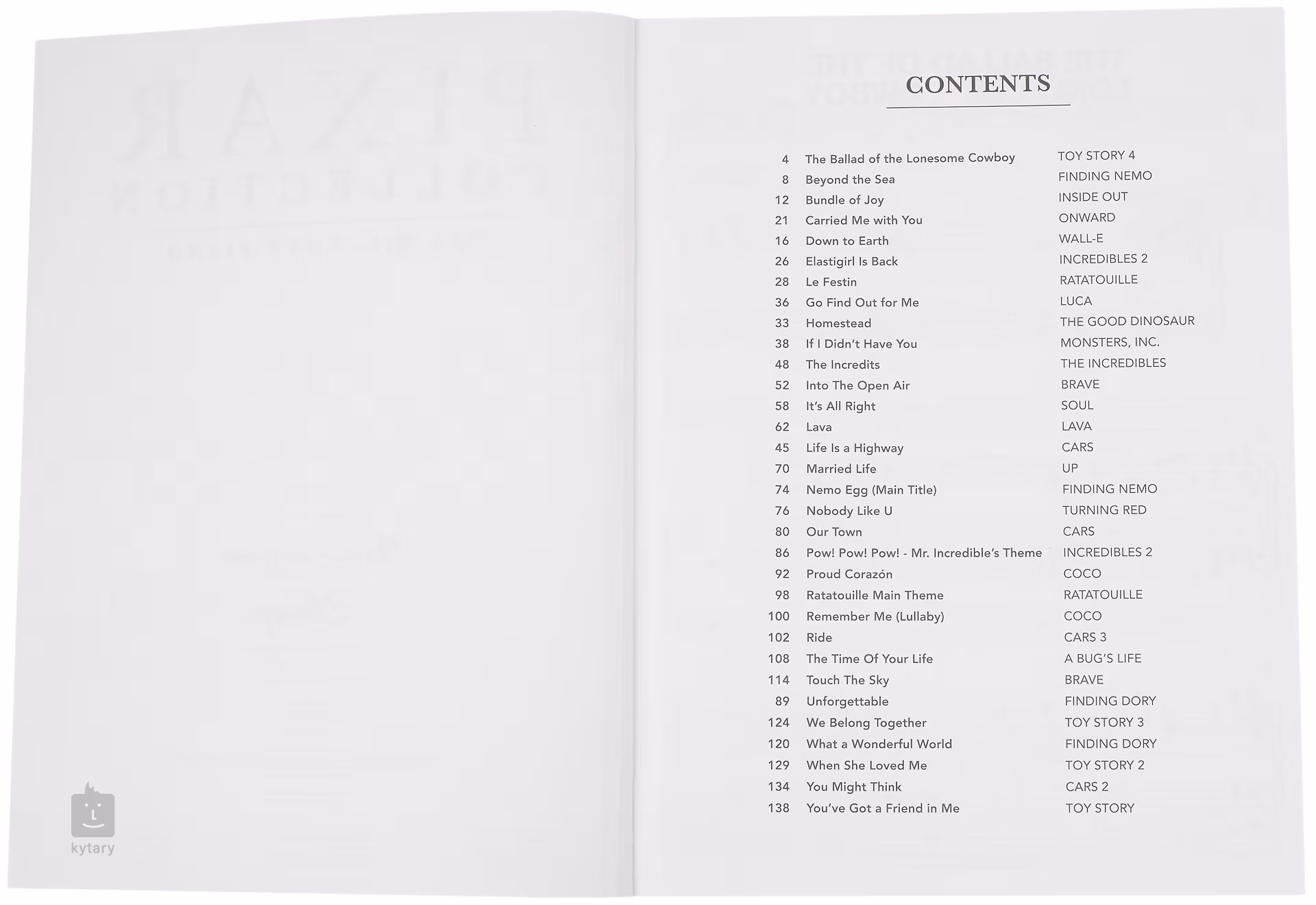 Titelliste: 1. du hast einen Freund in mir 2. es ist alles in Ordnung 3. Die Zeit deines Lebens 4. als sie mich liebte 5. wenn ich dich nicht hätte 6. wir gehören zusammen 7. Unsere Stadt 8. Eheleben 9. Fahrt 10. Jenseits des Meeres 11. Die Unglaublichen 12. das Bündel der Freude 13. das Festin 14. das Hauptthema von Ratatouille 15. down to earth 16. Nemo Egg (Haupttitel) 17. Unvergesslich 18. ins Freie 19. berühre den Himmel 20. lava 21. Gehöft 22. stolzer Corazon 23 Remember Me (Wiegenlied) 24. Pow! Peng! Pow! - Mr. Incredibles Theme 25. elastigirl ist zurück 26. die Ballade des einsamen Cowboys 27. habe mich mit dir getragen 28. niemand wie du 29. "Go Find Out For Me 30 Das Leben ist ein Highway 31. was für eine wunderbare Welt 32. Du denkst vielleicht