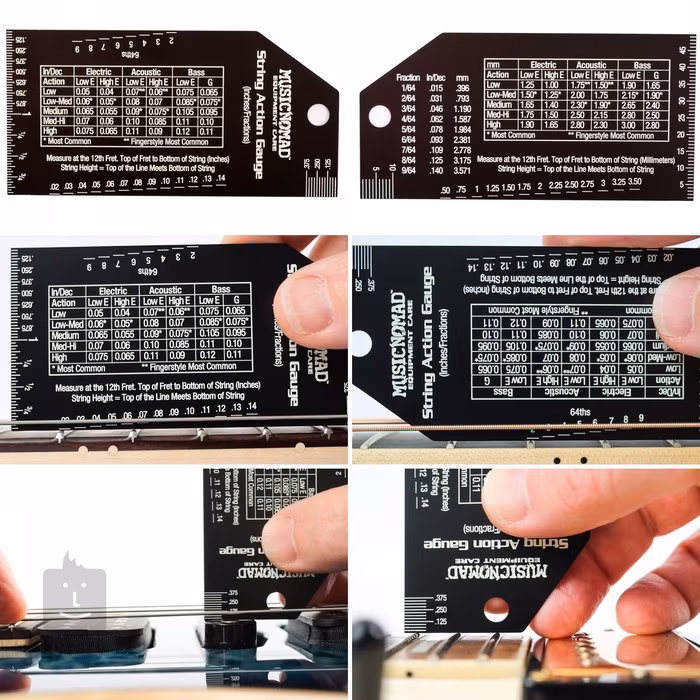 Dieses Saitenhöhenmessgerät vereint Präzision, Qualität und Funktionalität, um die präzise Einstellung Ihres Instruments sehr einfach und schnell zu machen. Das Werkzeug ist aus hochwertigem Edelstahl in schwarzer Ausführung gefertigt und verfügt über geätzte Markierungen und Ziffern in markanter weißer Farbe. Dies sorgt für einen klaren Kontrast und gewährleistet auch nach jahrelangem Gebrauch eine gute Lesbarkeit. Auf dem Werkzeug finden Sie sowohl metrische als auch imperiale Maßsysteme sowie eine praktische und übersichtliche Tabelle mit idealen Maßen für verschiedene Werkzeuge. Es ist auch mit einem Lineal ausgestattet, mit dem die Höhe der Tonabnehmer eingestellt werden kann, oder mit unterschiedlich langen Seiten, um die richtige Bundhöhe zu überprüfen.
