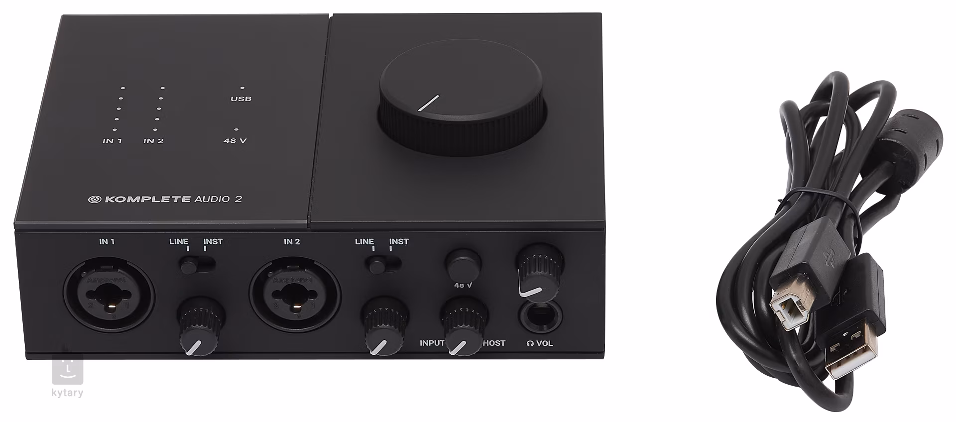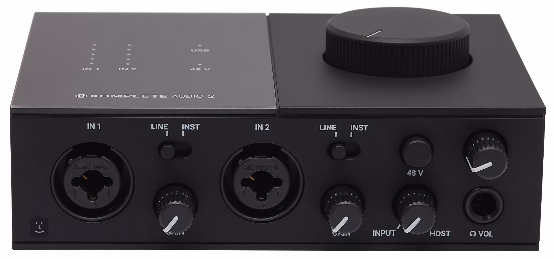 Komplete Audio 2 verfügt über zwei kombinierte XLR/Klinken-Eingänge, die sich für Stereoaufnahmen eignen. Auf der Rückseite befinden sich zwei Klinkenbuchsen für den Anschluss an Studiomonitore oder ein Mischpult. Außerdem gibt es eine Phantomspeisung für den Einsatz mit professionellen Kondensatormikrofonen.