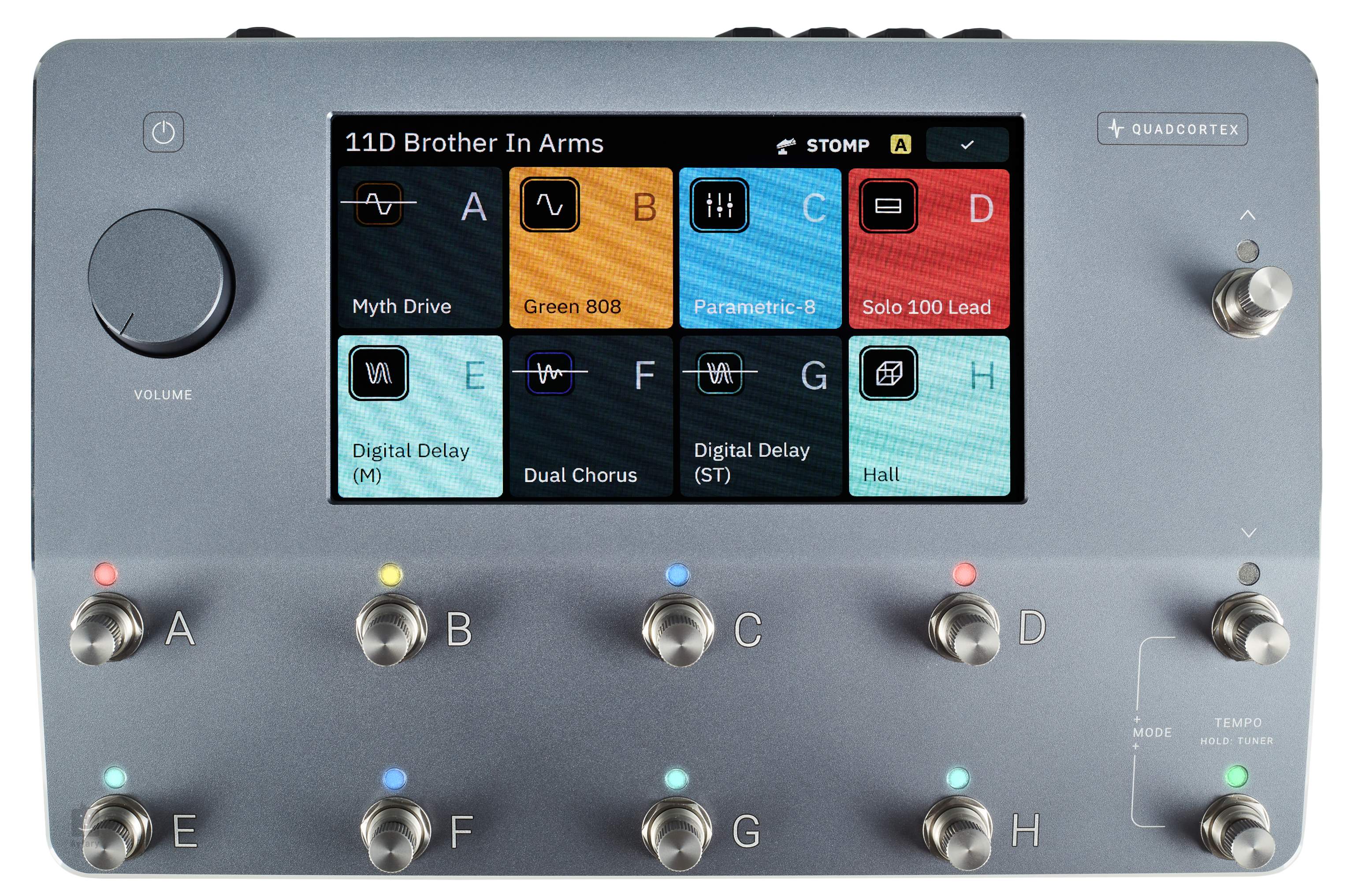 Der Neural DSP Quad Cortex ist ein leistungsstarker Floor-Modeler/Multi-Effekt für E-Gitarre/Bass mit einem 2-GHz-DSP-Prozessor (Quad-Core SHARC), einem 7-Zoll-Multi-Touch-Display und elf 2-in-1-Dual-Fußschaltern, die auch als Drehregler fungieren.