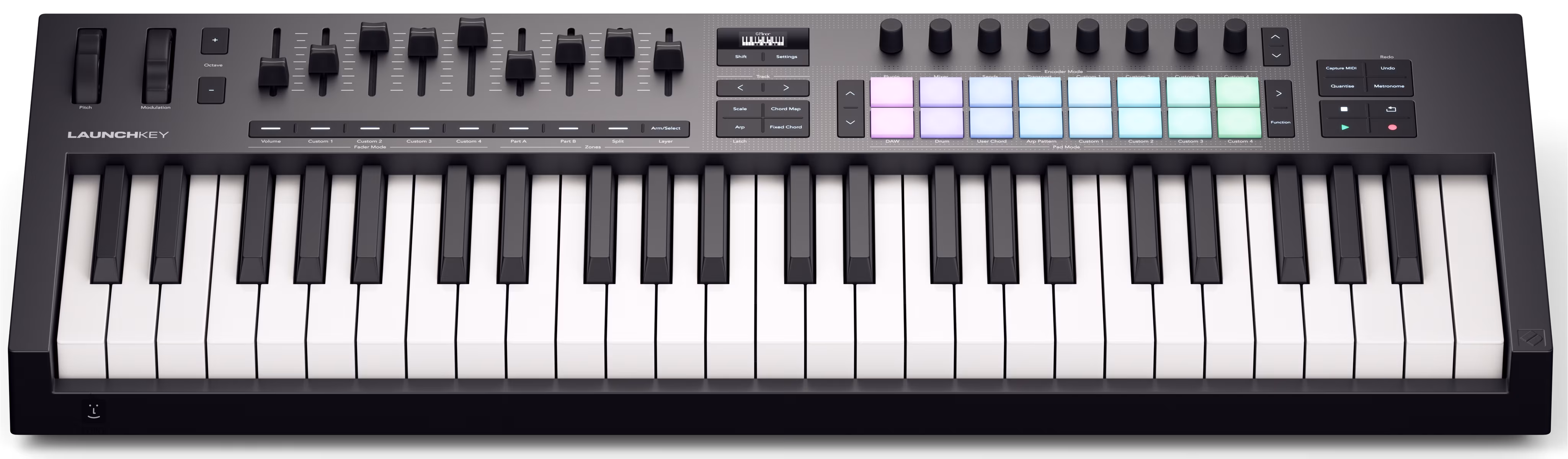 Der Novation Launchkey 49 ist ein leistungsstarker DAW-Controller mit einer halbgewichteten Wasserfall-Tastatur, acht stufenlosen Encodern, neun Fadern und 16 drucksensitiven Pads für Fingerdrumming und Clip-Triggering. Der Controller verfügt außerdem über kreative Akkord- und Skalenmodi, die mit dem OLED-Display zusammenarbeiten und es leicht machen, in der Stimmung zu bleiben.