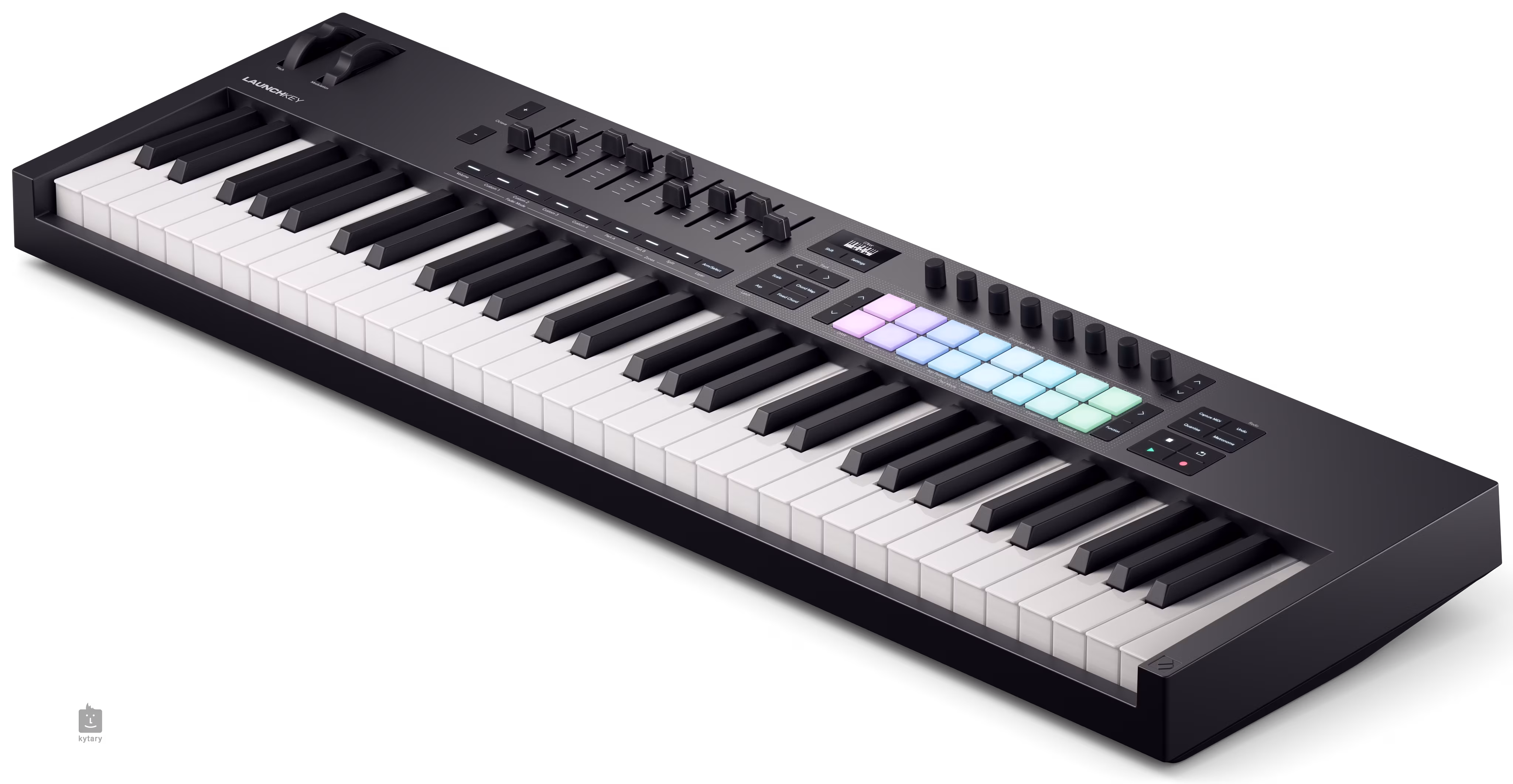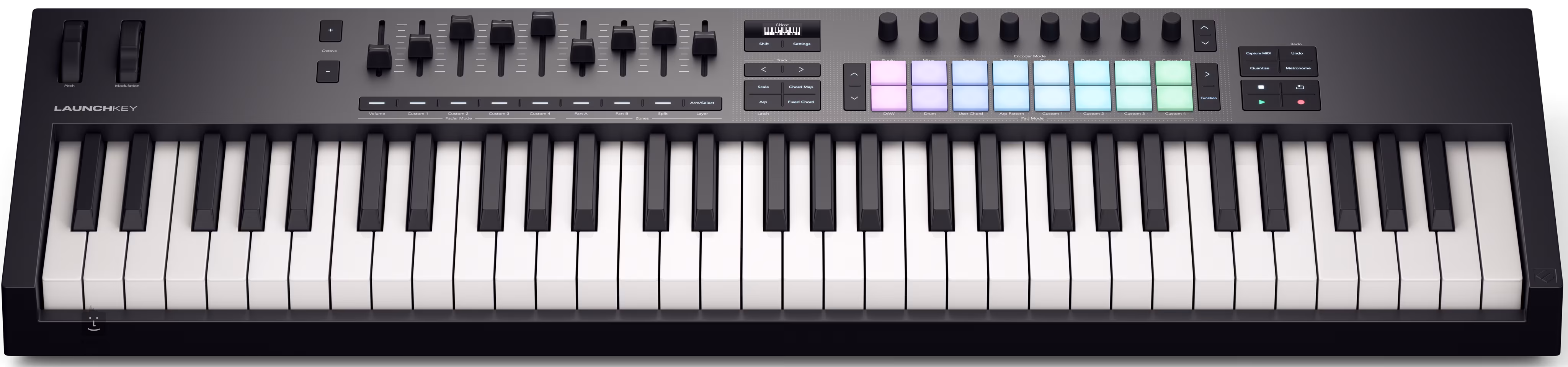 Der Novation Launchkey 61 ist ein leistungsstarker DAW-Controller mit einer halbgewichteten Wasserfall-Tastatur, acht stufenlosen Encodern, neun Fadern und 16 drucksensitiven Pads für Fingerdrumming und Clip-Triggering. Der Controller verfügt außerdem über kreative Akkord- und Tonleitermodi, die mit dem OLED-Display zusammenarbeiten, um das Stimmen zu erleichtern.