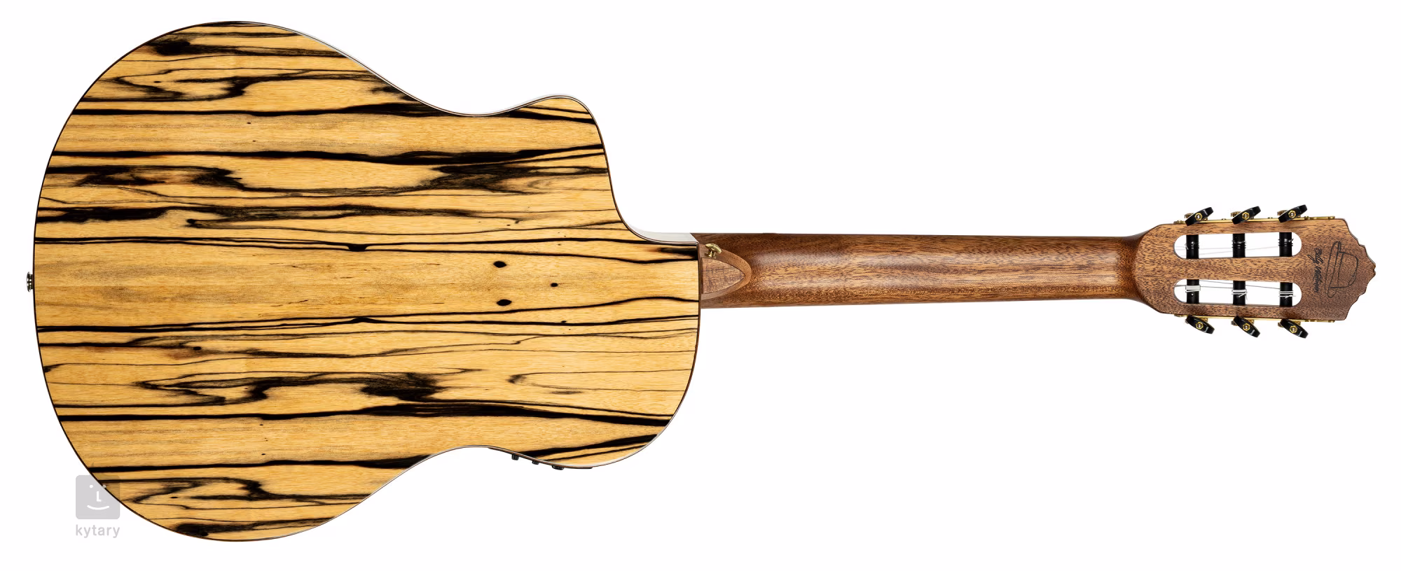Die Vorderseite der Gitarre ist aus massiver amerikanischer Fichte gefertigt, während Boden und Zargen aus handverlesenem weißem Ebenholz mit exklusiver Maserung bestehen. Der Spielkomfort wird durch die ergonomische Armlehne und den unteren Korpusausschnitt auf ein höheres Niveau gehoben. Der schmalere Mahagonihals ist mit einem Ebenholzgriffbrett mit neunzehn Bünden ausgestattet. Die Saiten sind in die hauseigenen Mechaniken und das Ebenholz-Griffbrett eingespannt. Die schöne Verarbeitung wird durch das Akazienkorpus-Binding, die Perlmuttimitation der Decke und die Holzrosette akzentuiert.