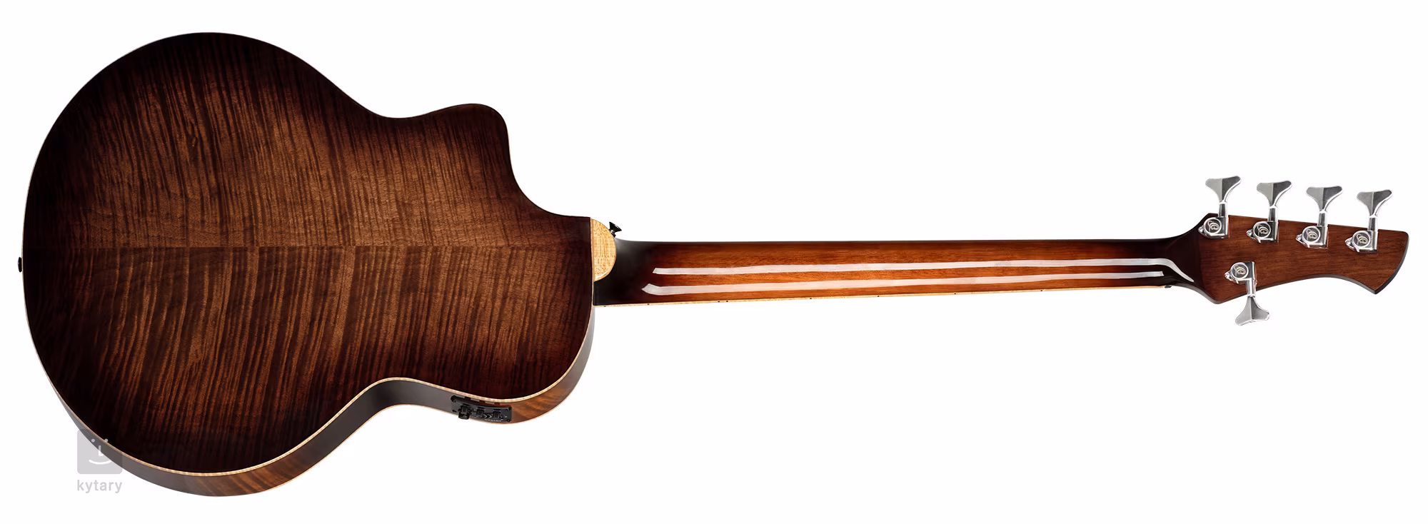 Der schmalere "Thinline"-Korpus des Basses besteht aus massiver Fichte an der Vorderseite und geflammtem Mahagoni an Boden und Zargen. Eine Whiskey Burst-Lackierung bringt den Ahorn zur Geltung. Ein Palisander-Griffbrett ist auf den Nato-Hals geleimt. Die Zwei-Wege-Halsverstrebung ermöglicht eine präzise Einstellung des Finishs. Der Spielkomfort wird durch den tieferen Cutaway, der den Zugang zu den höheren Griffbrettpositionen erleichtert, und die integrierte Armlehne auf ein höheres Niveau gehoben.