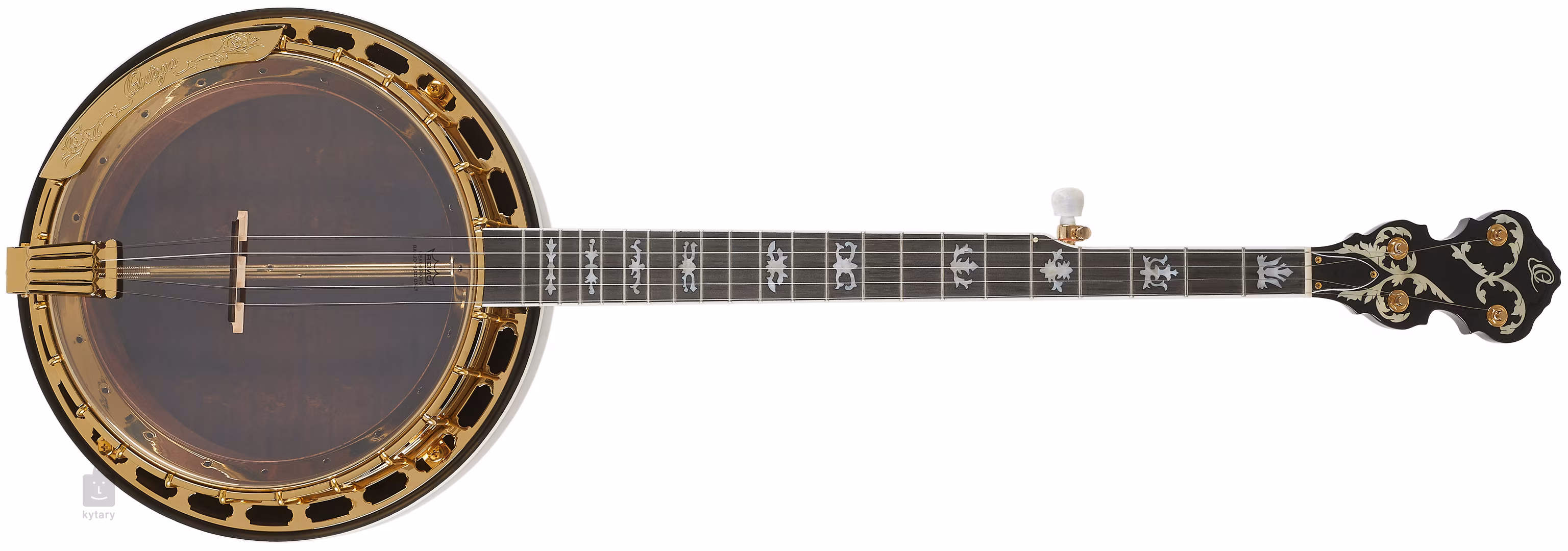 Das OBJ850-MA ist ein luxuriöses fünfsaitiges Banjo mit geschlossenem Boden, d.h. mit einer geschlossenen Bodenplatte in Form eines Resonanzkörpers aus gemasertem Ahorn mit einer schönen Holzmaserung. Es hat einen Tonring aus Messing, einen Hals aus hartem Ahorn mit Schnitzereien auf der Kopfplatte, ein Palisander-Griffbrett mit Einlagen, eine Schulterstütze mit Gravuren mit dem Firmenmotiv, einen einteiligen Flansch, einen Korpus aus drei Lagen massivem Ahorn und ein am Rand befestigtes Remo-Schutzblech. Traditionsliebhaber werden sich über den Einbau der Saiten in verchromte Geared-Mechaniken freuen, die wie klassische Friction-Mechaniken aussehen, aber eine stabilere und genauere Stimmung ermöglichen. Das exklusive Design wird durch goldene Hardware akzentuiert.