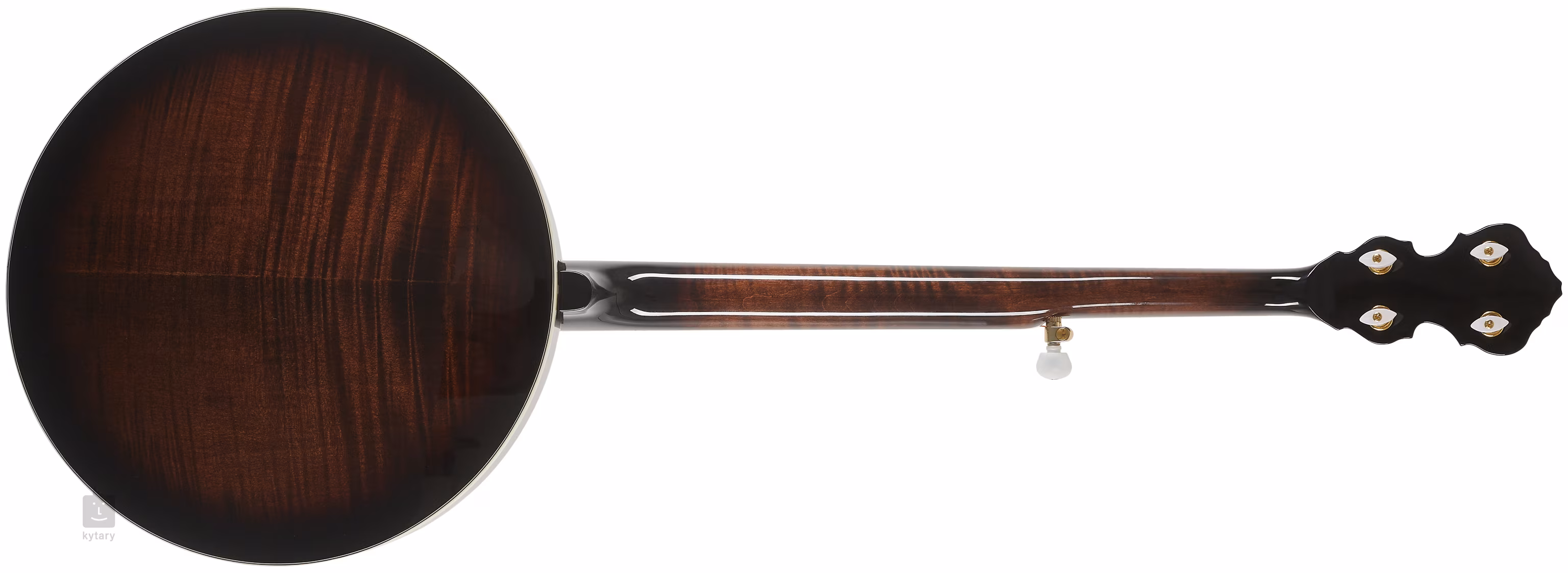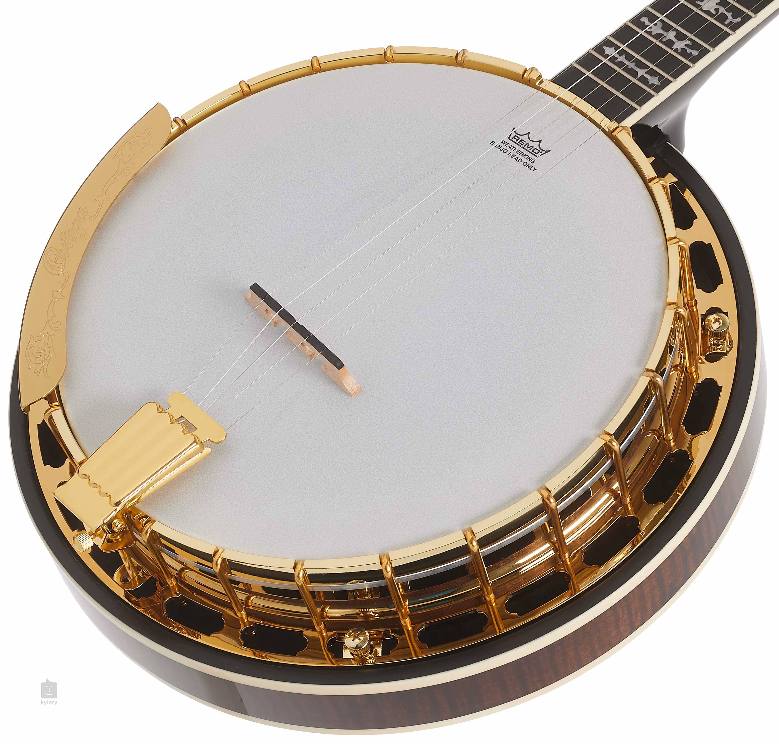 Das OBJ950-MA ist ein luxuriöses fünfsaitiges Banjo mit geschlossenem Boden, d.h. mit einer geschlossenen Bodenplatte in Form eines Resonanzkörpers aus gemasertem Ahorn mit einer schönen Holzmaserung. Es hat einen Tonring aus Messing, einen Hals aus gemasertem Ahorn, ein Ebenholz-Griffbrett mit kunstvollen Einlagen, eine Schulterstütze mit Gravuren des Firmenmotivs, einen einteiligen Flansch, einen Korpus aus drei Schichten massiven Ahorns und ein am Rand befestigtes Remo-Schutzblech. Traditionsliebhaber werden sich über den Einbau der Saiten in verchromte Geared-Mechaniken freuen, die wie klassische Friction-Mechaniken aussehen, aber eine stabilere und genauere Stimmung ermöglichen. Das exklusive Design wird durch goldene Hardware akzentuiert.