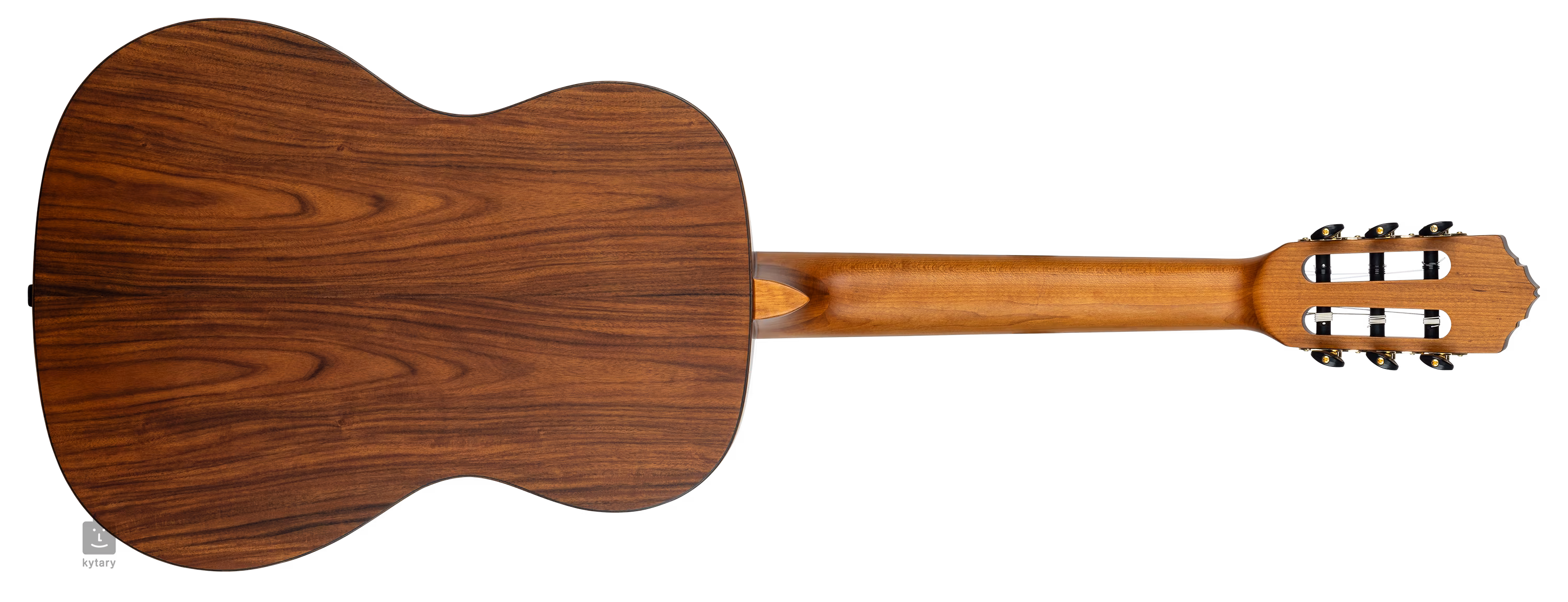 Die Decke der R23RO-Klassikgitarre besteht aus massiver "gebackener" Fichte, während Boden und Zargen aus laminiertem Pau Ferro gefertigt sind. Der schmale Hals (extra schlankes Profil) aus wärmebehandeltem Ahorn ist mit einem "gebackenen" Jatoba-Griffbrett mit neunzehn Bünden verleimt. Interessanterweise hat das Instrument eine etwas kürzere Mensur (630 mm) und einen schmaleren Nullbund (47 mm).
