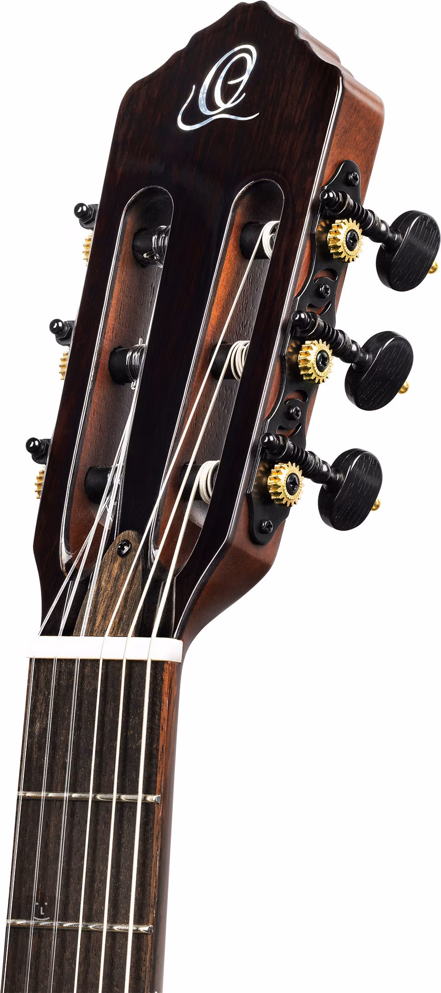 Für den Klang sorgt die aktive Ortega MagusX/G-Elektronik mit Dreiband-Equalizer und eingebautem Stimmgerät. Die Saiten sind über einem Knochengriffbrett mit klassischen Mechaniken in schwarzem Finish und einem Feigenholzgriffbrett montiert. Die schöne Verarbeitung wird durch das weiße Korpus- und Griffbrett-Binding und die Perlmutt-Positionspunkte am zwölften Bund unterstrichen.