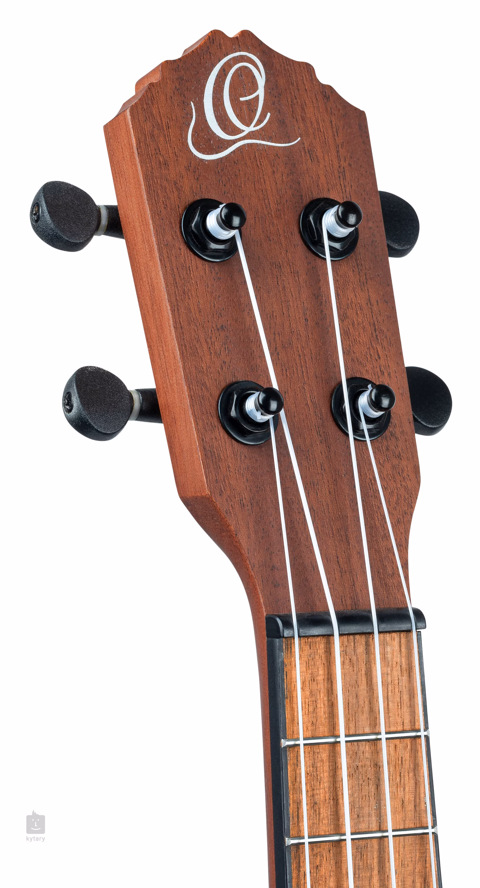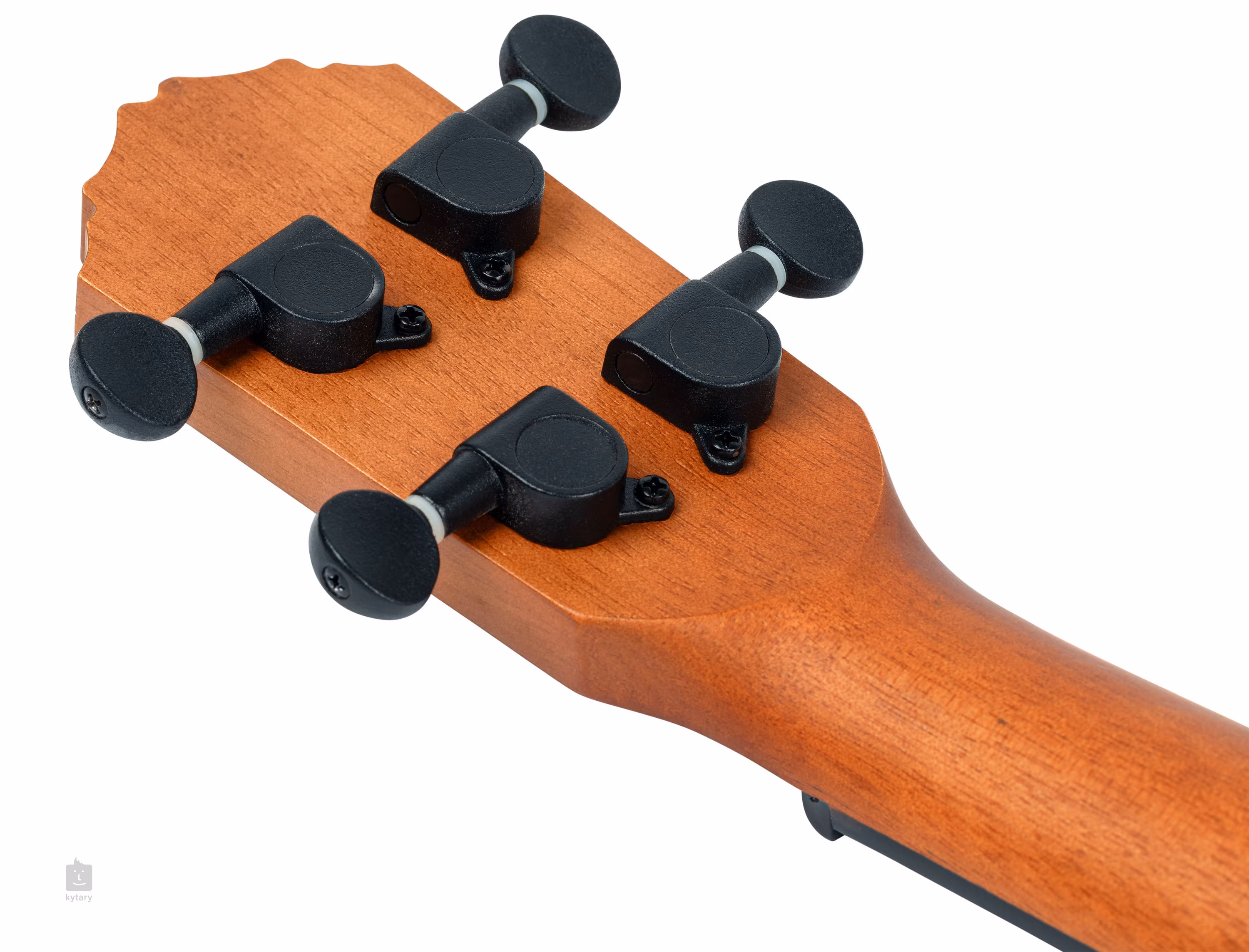 Die Vorderseite der RU4-Konzert-Ukulele besteht aus Fichtensperrholz, das durch Sapele-Sperrholz an Boden und Zargen ergänzt wird. Der Resonanzboden ist von einer Schildpattumrandung umgeben. Auf den Mahagoni-Hals ist ein Walnuss-Griffbrett mit achtzehn Bünden geleimt, und Positionspunkte erleichtern die Navigation auf der Oberfläche. Die Saiten werden von einem Griffbrett aus Walnussholz und schwarzen Stimmmechaniken im Gitarrenstil gehalten.