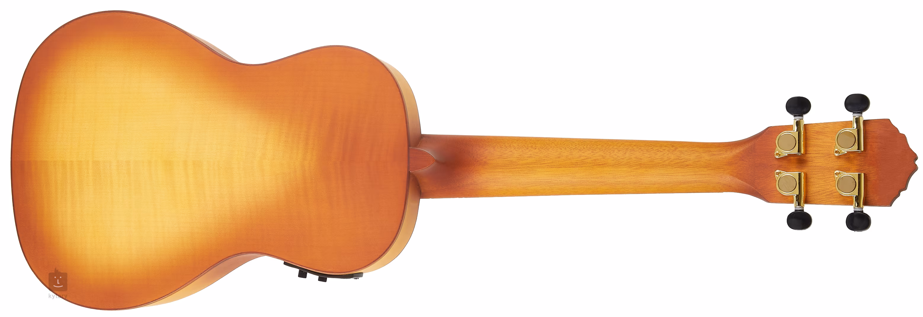 Der Korpus der Ukulele besteht aus furniertem Ahornsperrholz mit schöner Maserung. Der Okoumé-Hals ist mit einem Walnuss-Griffbrett mit achtzehn Bünden ausgestattet. Die Saiten werden in einem vergoldeten Saitenbrett über dem Nullbund und dem Knochensattel gehalten, ebenso wie goldene gitarrenartige Mechaniken mit schwarzen Wirbeln. Das edle Aussehen des Instruments wird durch die Korpuseinfassung aus Walnussholz und das Firmenlogo auf der Kopfplatte unterstrichen.