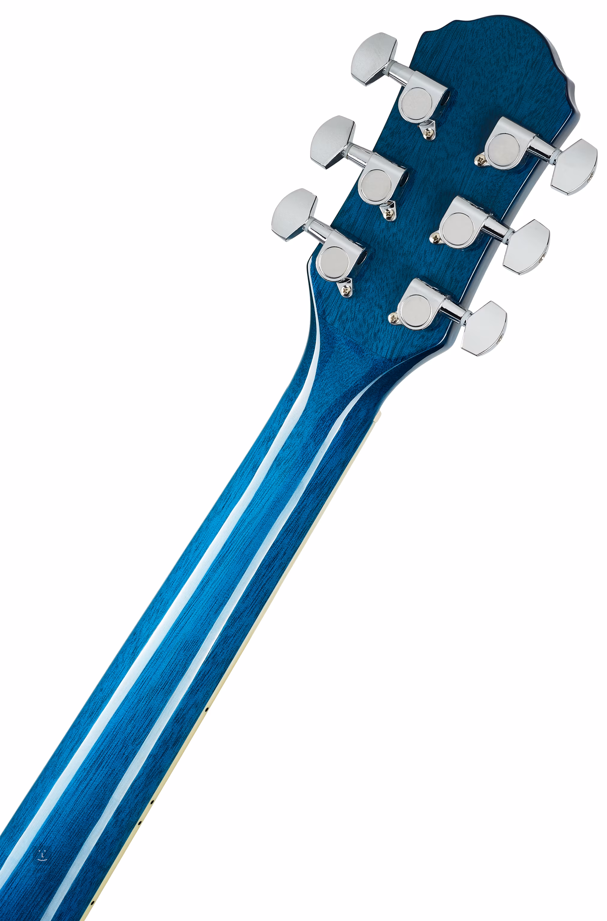 Die Saiten sind in einer verchromten Druckgussmechanik gelagert. Der optische Eindruck wird durch das Binding, die Rosette und das Logo auf der Kopfplatte unterstrichen.