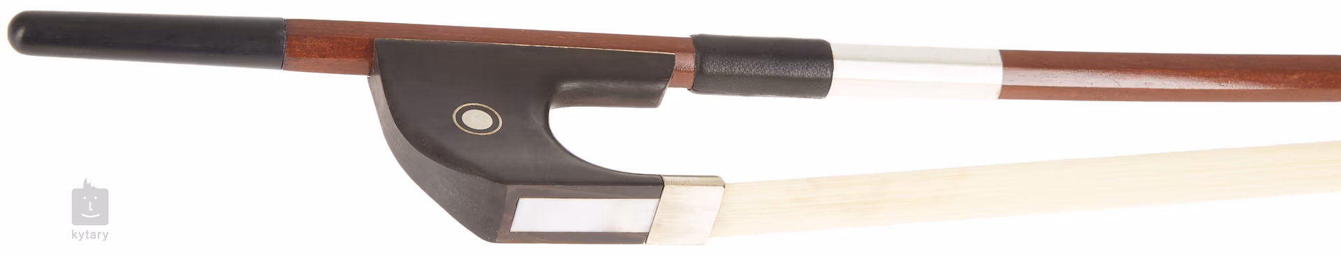 Holzbogen nach deutscher Art mit Ebenholzfrosch. Er ist für Kontrabass geeignet, hat eine 4/4-Größe und einen achteckigen Stab.