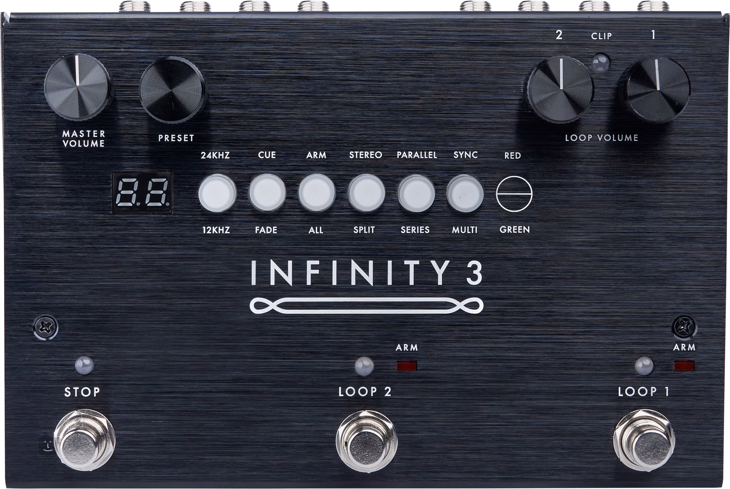 Das Pigtronix Infinity 3 ist ein Stereo-Doppel-Looper-Pedal mit zwei unabhängigen Spuren und einer benutzerfreundlichen Oberfläche für den Einsatz beim Komponieren, Arrangieren und bei Live-Auftritten. Er bietet eine Kapazität von 3 Stunden Aufnahmezeit und 50 Presets, die in fünf Zehnerbänken angeordnet sind, mit Standardoptionen zum Kopieren, Speichern und Löschen. Infinity 3 garantiert latenzfreie Aufnahmen auf zwei Stereospuren, die parallel (Layering übereinander) oder in Reihe (Strophe-Chorus-Modell) geschaltet werden können.