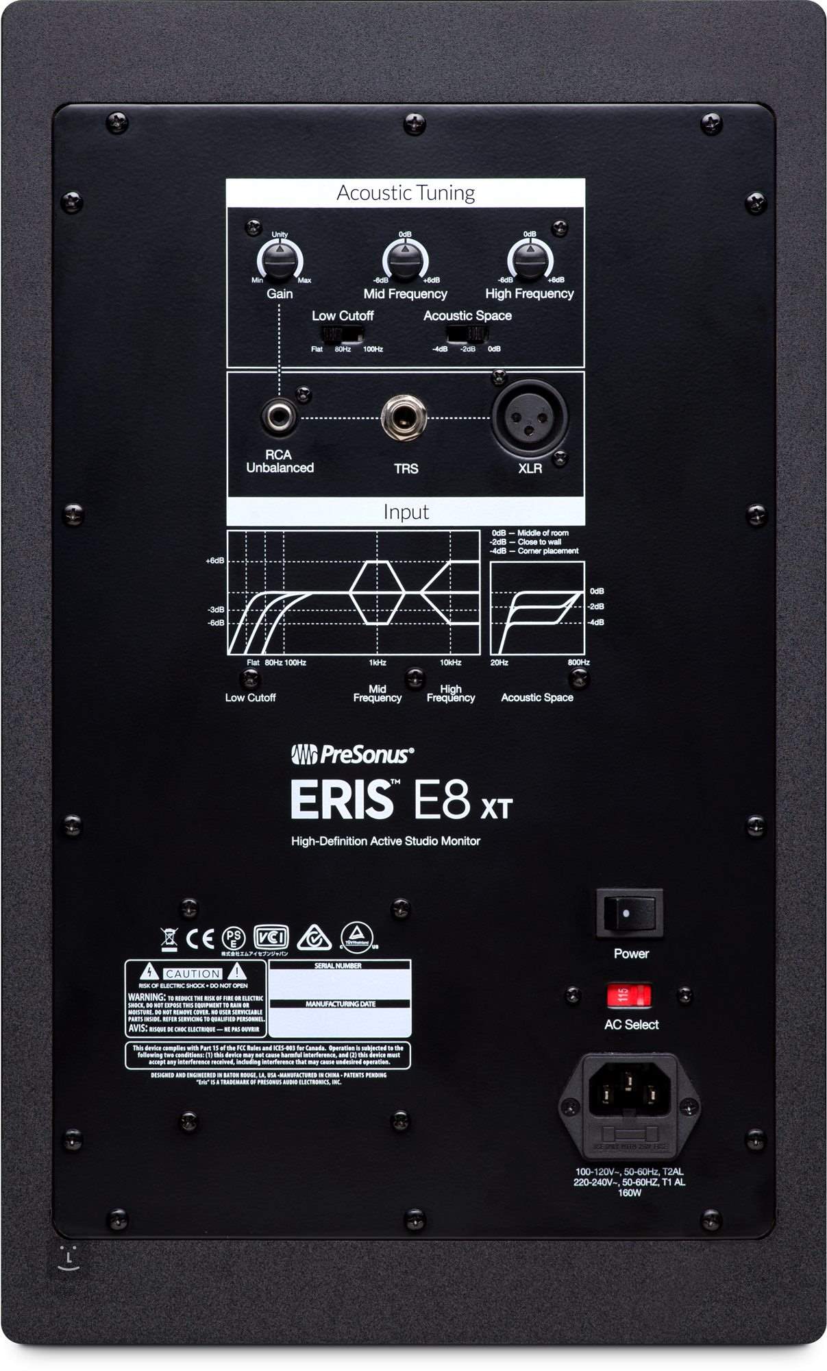 Stimmen Sie Ihre Monitore auf Ihren eigenen Raum ab Wir wissen, dass ein modernes Aufnahmestudio heutzutage absolut überall untergebracht werden kann, sei es in einem kleinen Schlafzimmer oder in einem eigens errichteten, mehrere Millionen Dollar teuren Gebäude. Aus diesem Grund ist jeder unserer Studiomonitore mit Reglern ausgestattet, mit denen Sie jederzeit den ausgewogensten Frequenzgang für Ihre spezielle Umgebung einstellen können. Mit den Reglern für die akustische Abstimmung können Sie die Eris E8 XT-Monitore perfekt an Ihren Raum anpassen. Es gibt einen Low-Cut- sowie einen Mid- und High-Regler und einen dreistufigen Acoustic Space-Schalter, mit dem Sie Frequenzdefizite ausgleichen können, die durch die Aufstellung der Monitore in der Nähe von Wänden oder in der Ecke eines Raums entstehen.