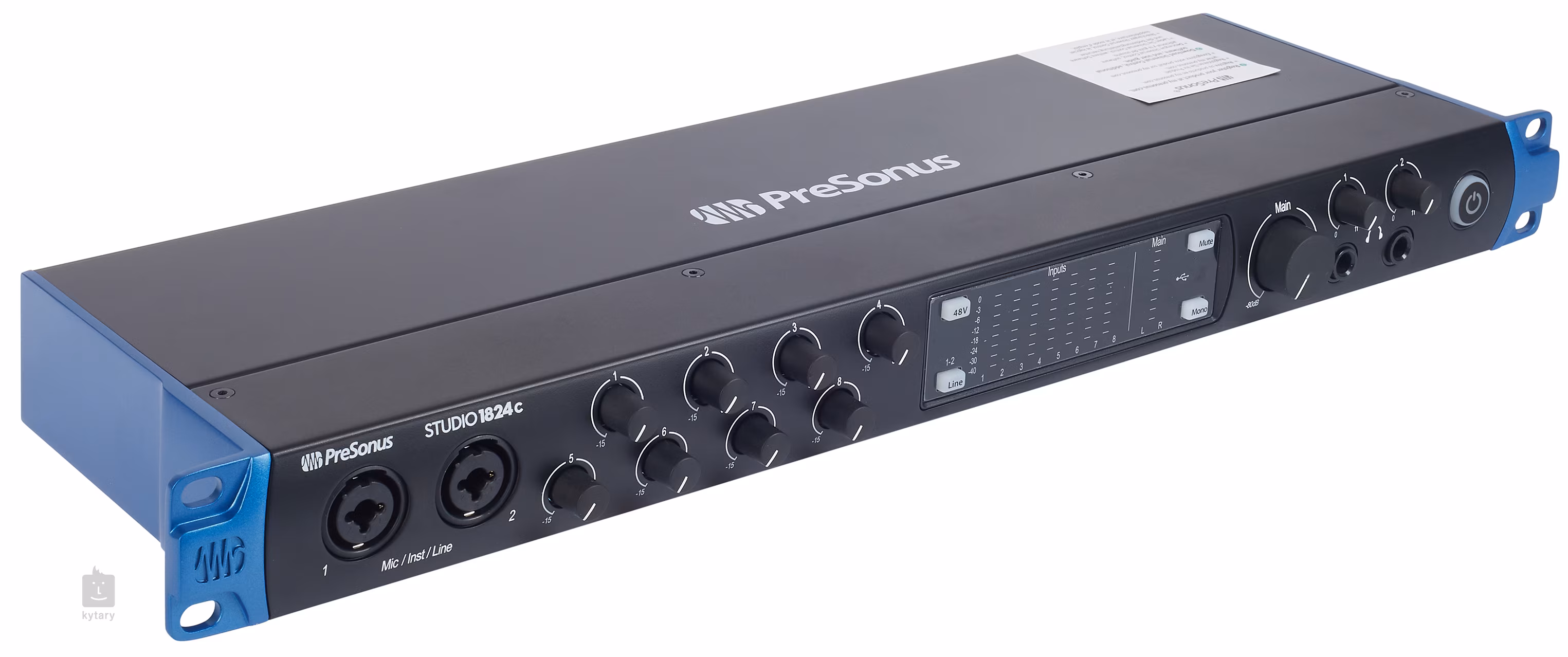 Presonus Studio 1824 bietet insgesamt 18 Eingänge und 24 Ausgänge. Zusätzlich zu den acht Mikrofon/Line-Eingängen gibt es acht digitale Kanäle über den ADAT-Anschluss und einen digitalen Stereo-S/PDIF-Eingang. 10 analoge Ausgänge und zwei Kopfhörer-Stereoausgänge werden ebenfalls durch ADAT und S/PDIF ergänzt. Die Konnektivität erfolgt über USB 2.0. Es gibt weder einen Clock-Ausgang für eine perfekte digitale Synchronisation mit dem Rest des Studios noch einen MIDI-Eingang.